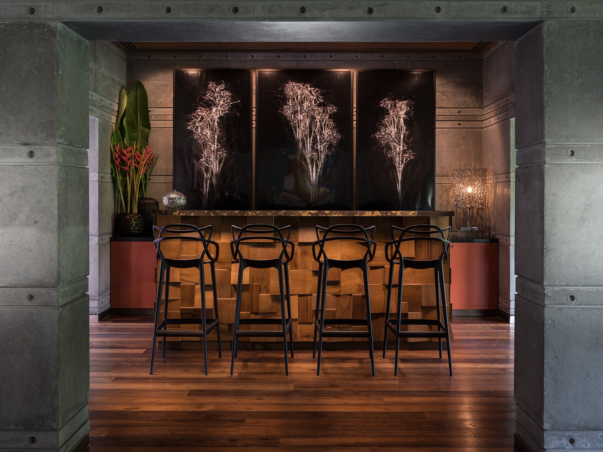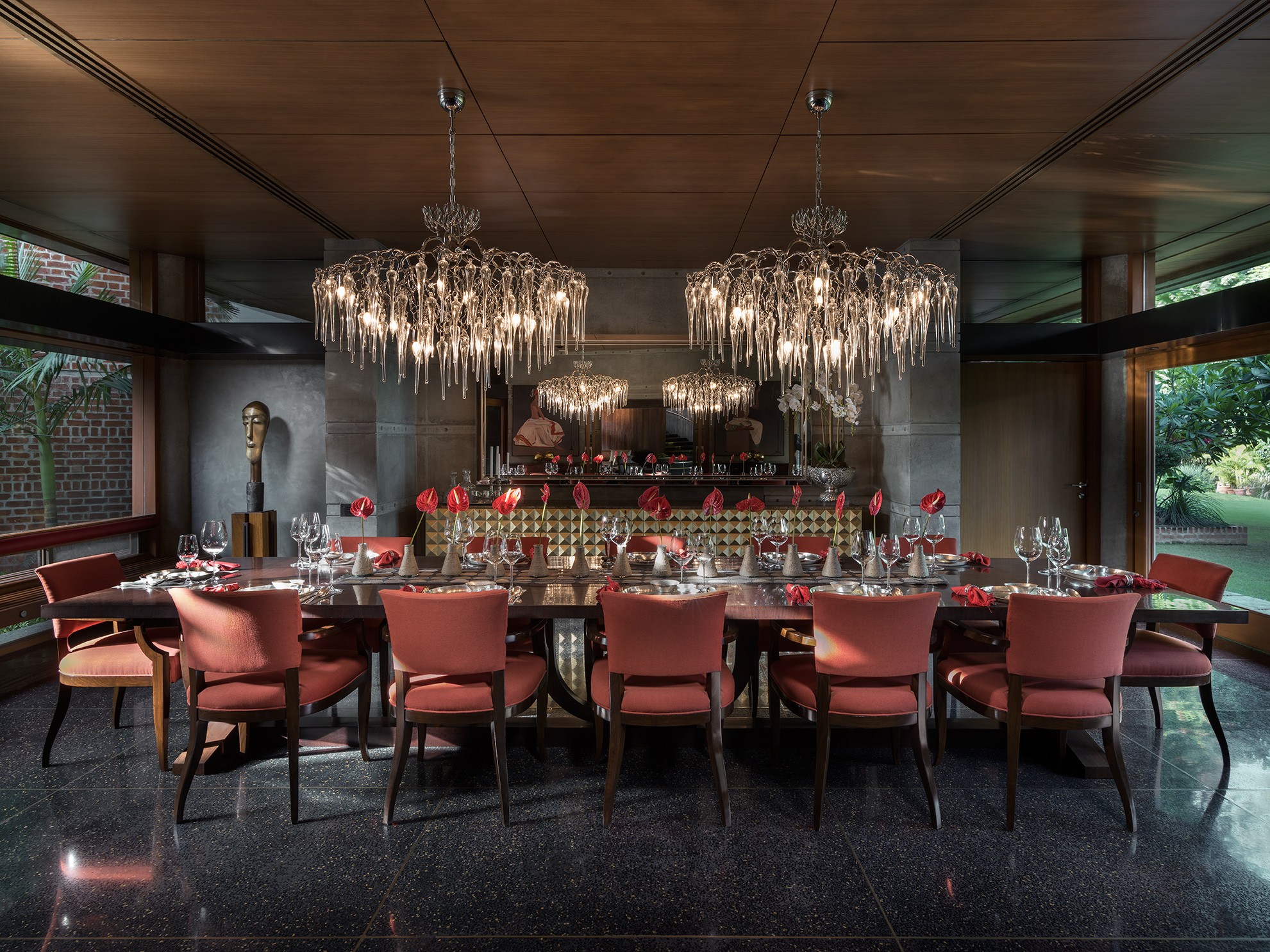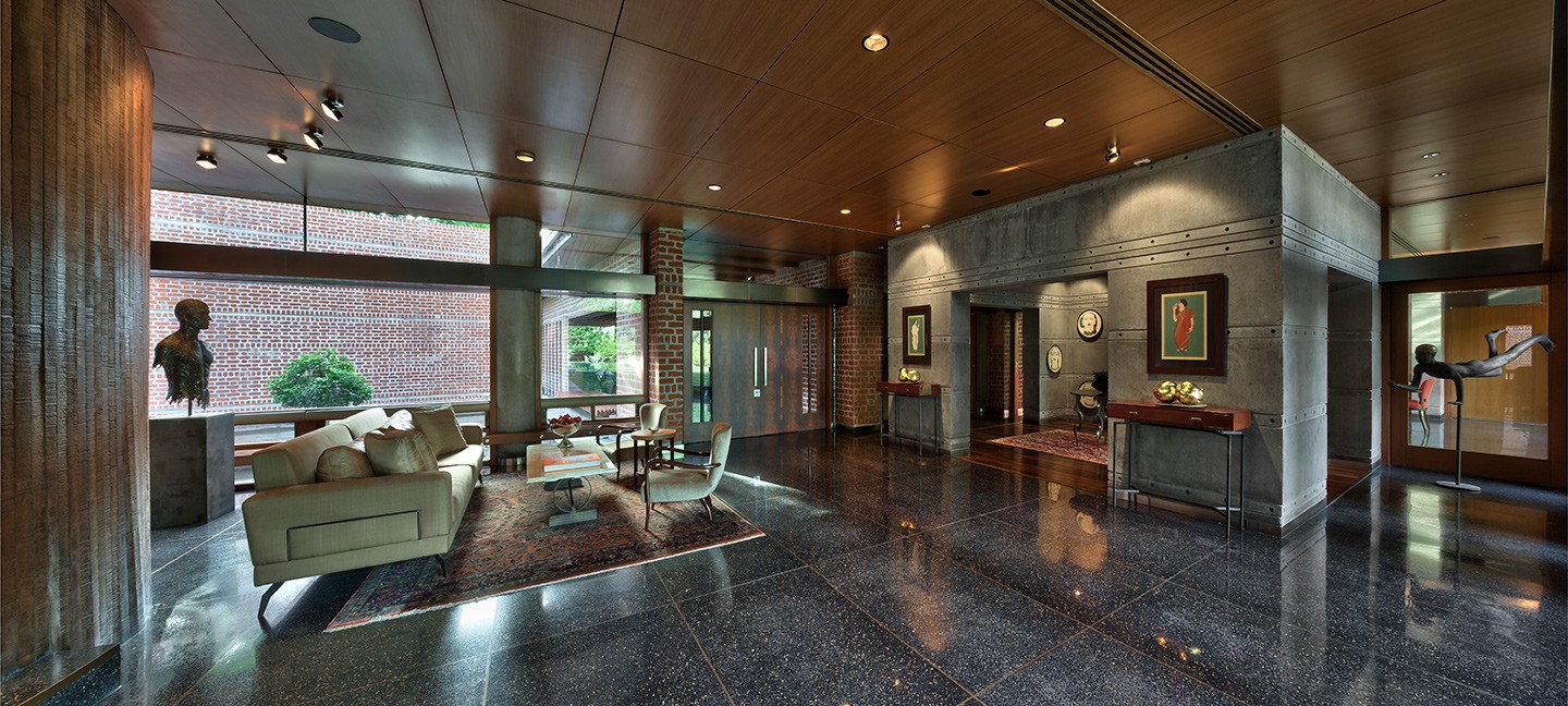 The bar and living room were spatially connected to suit the clients’ lifestyle, opening to the gardens and a water-facing courtyard. The living room enjoys expansive light and uninterrupted views across the property. Lighting was a critical consideration; wherever possible, downward architectural lighting was avoided to preserve the quiet, uninterrupted quality of the ceilings. Long-time patrons of contemporary art, the clients required clearly defined walls for major artworks and commissions. Furniture was largely custom-designed for its exact placement, allowing art, sculpture, and objects to integrate seamlessly into the architecture. Decorative lighting and mirrors were selected for both function and sculptural presence, heightening the drama within the otherwise muted architectural palette.