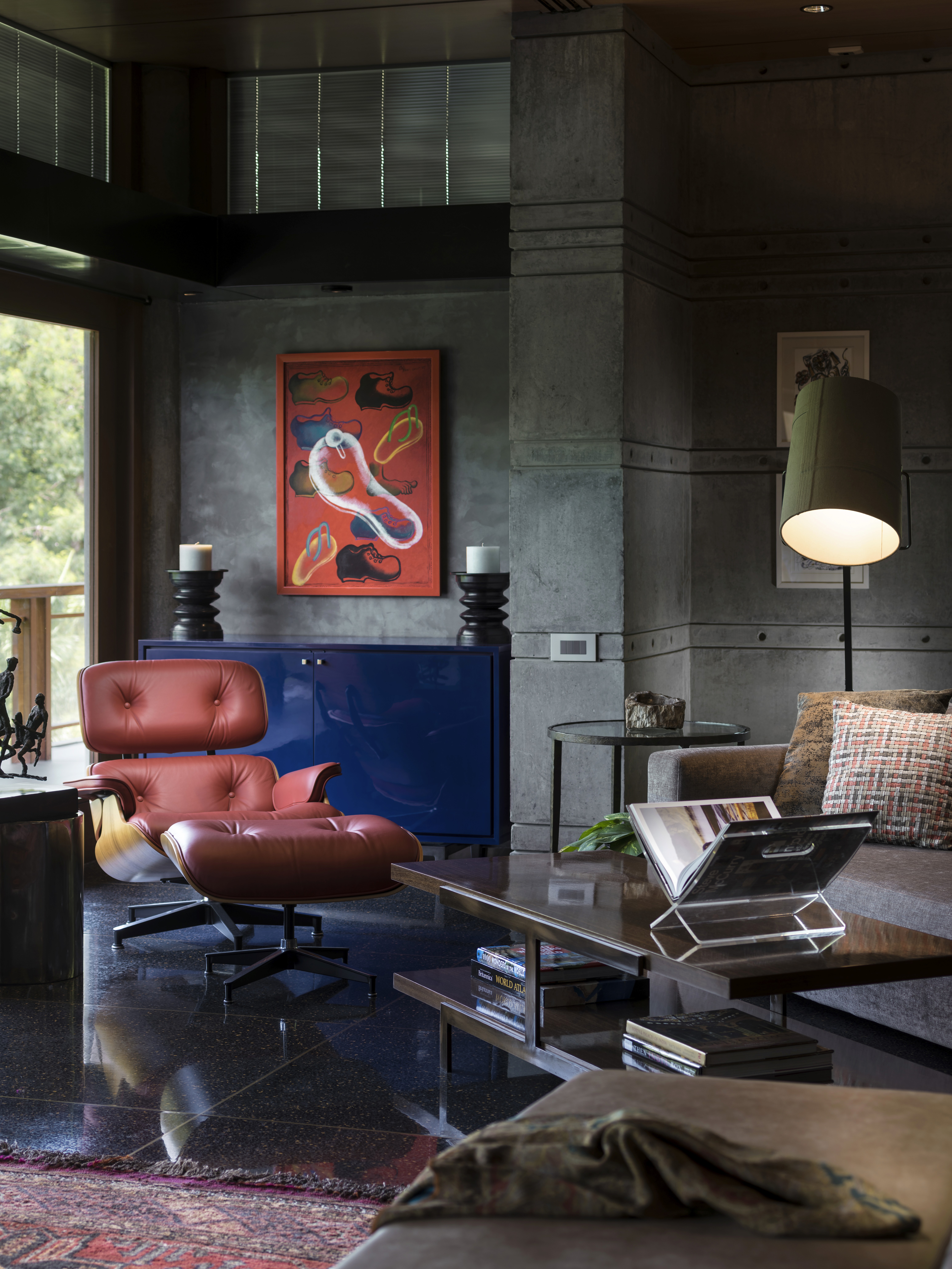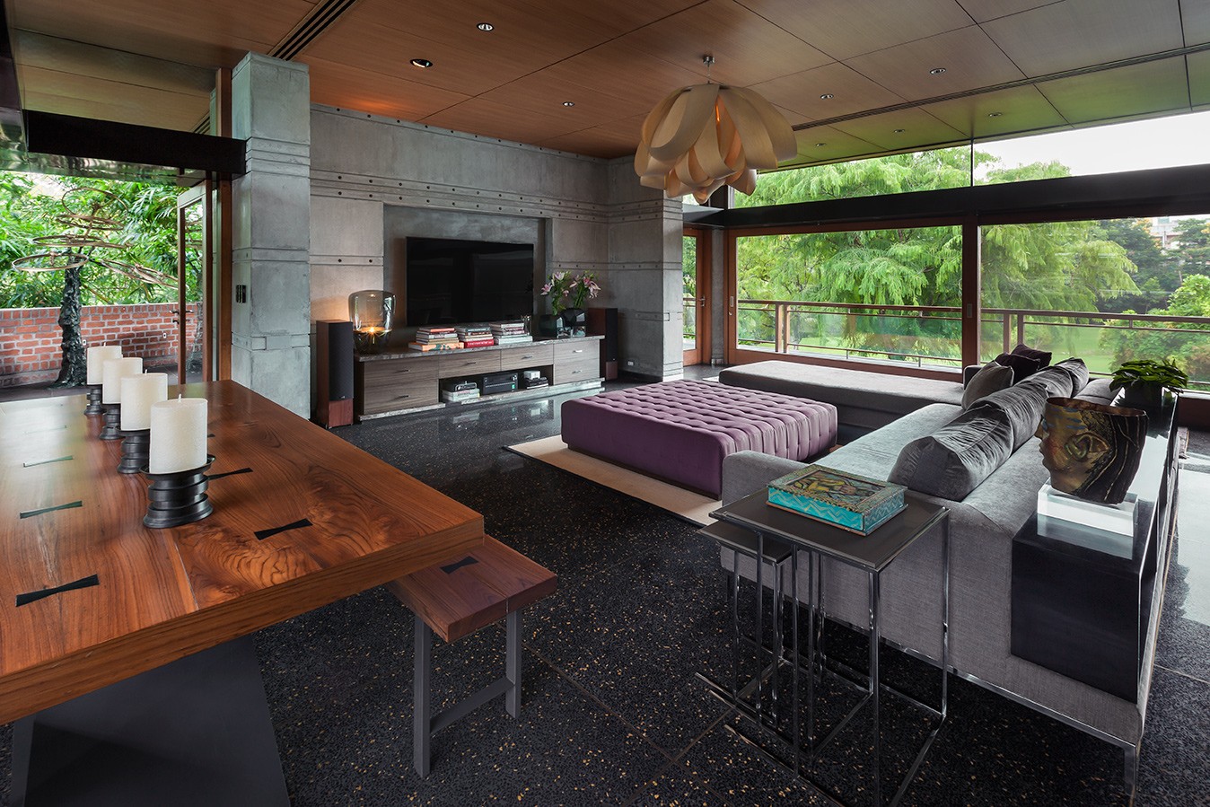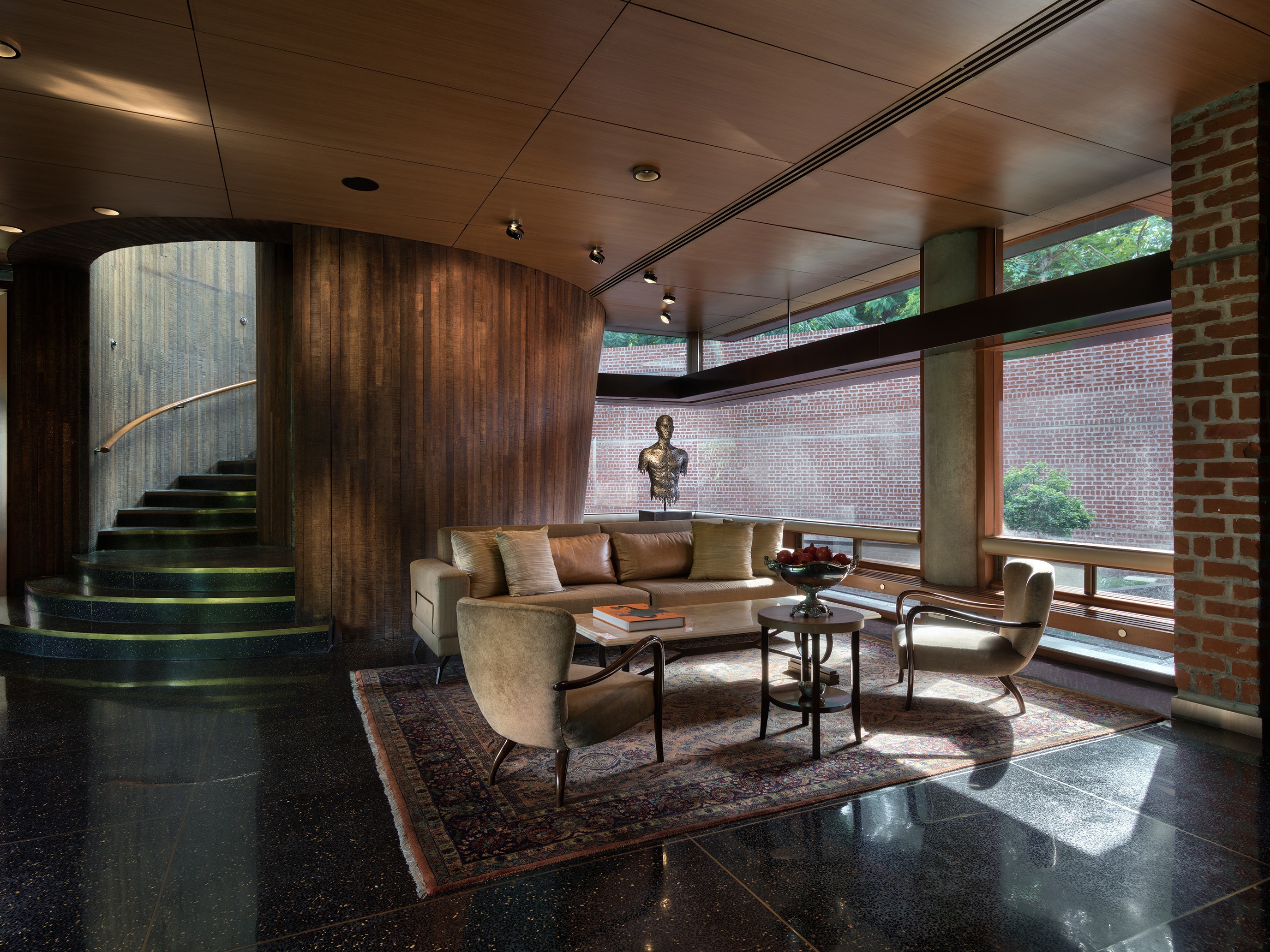 The bar and living room were spatially connected to suit the clients’ lifestyle, opening to the gardens and a water-facing courtyard. The living room enjoys expansive light and uninterrupted views across the property. Lighting was a critical consideration; wherever possible, downward architectural lighting was avoided to preserve the quiet, uninterrupted quality of the ceilings. Long-time patrons of contemporary art, the clients required clearly defined walls for major artworks and commissions. Furniture was largely custom-designed for its exact placement, allowing art, sculpture, and objects to integrate seamlessly into the architecture. Decorative lighting and mirrors were selected for both function and sculptural presence, heightening the drama within the otherwise muted architectural palette.
