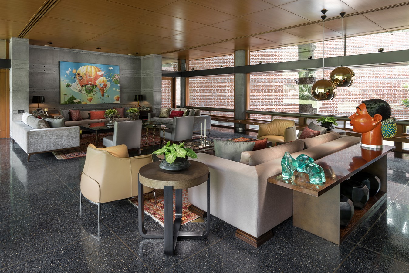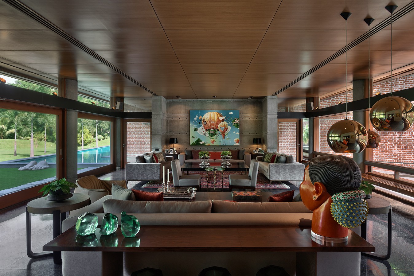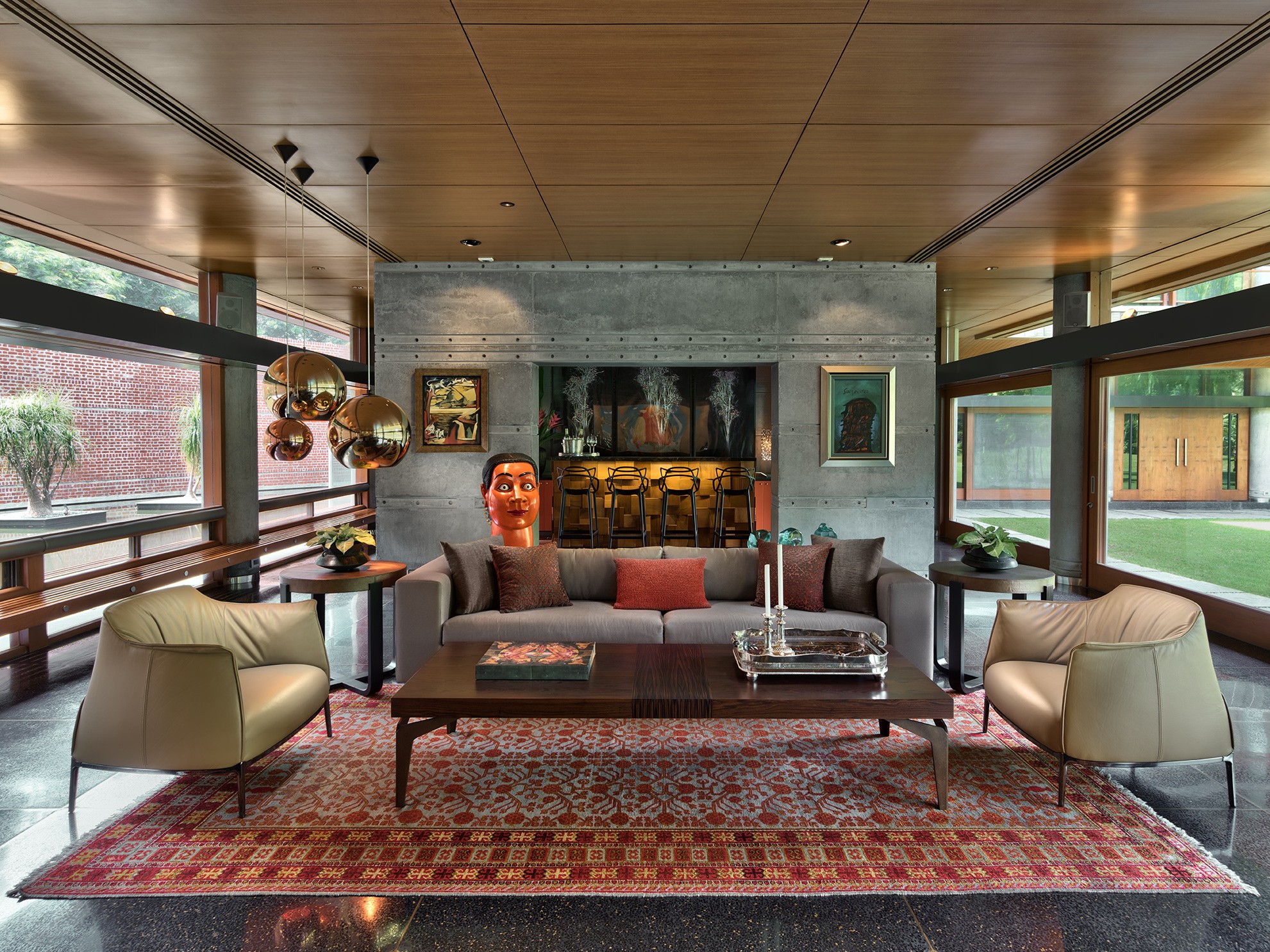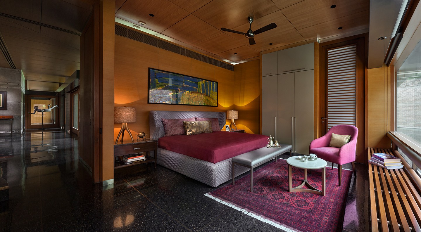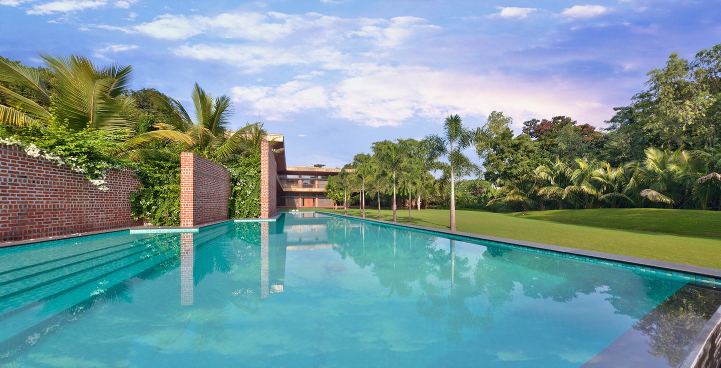 The house sits low against the horizon, its public spaces arranged on the ground floor and opening onto gardens on one side and a water body that curves gently around the property on the other. Private spaces occupy the first floor, while the overall L-shaped configuration maximises views and responds to the movement of the sun. From the outset, the design intent was contemporary and holistic—rooted in Indian sensibilities yet untethered to a specific style. The structure was intentionally expressed rather than concealed: exposed concrete walls, long stretches of brickwork, and a conical staircase connecting the two floors and sitting proudly within the entrance lobby anchor the architectural experience. These raw, tactile elements are juxtaposed with warm, finely detailed veneered ceilings, creating a dialogue between the robust and the refined.