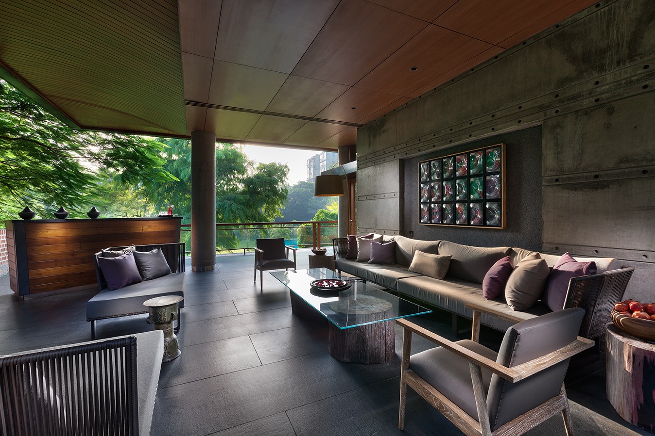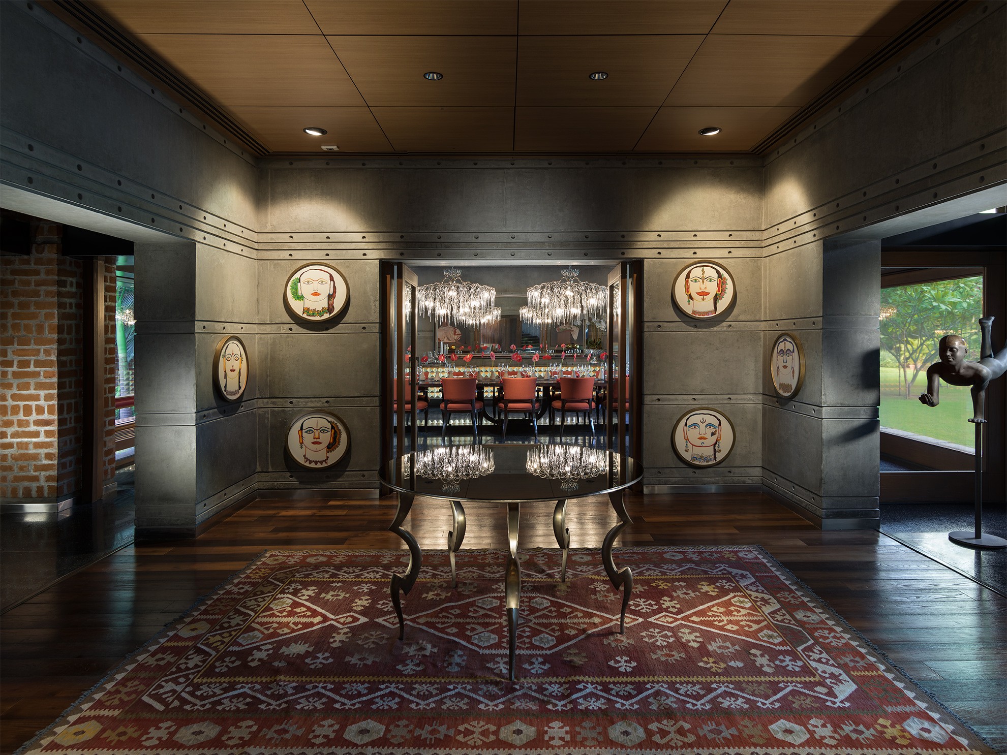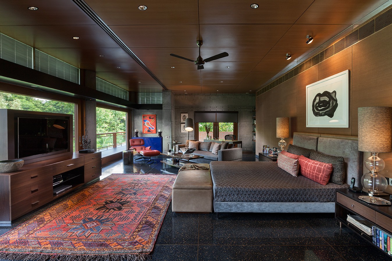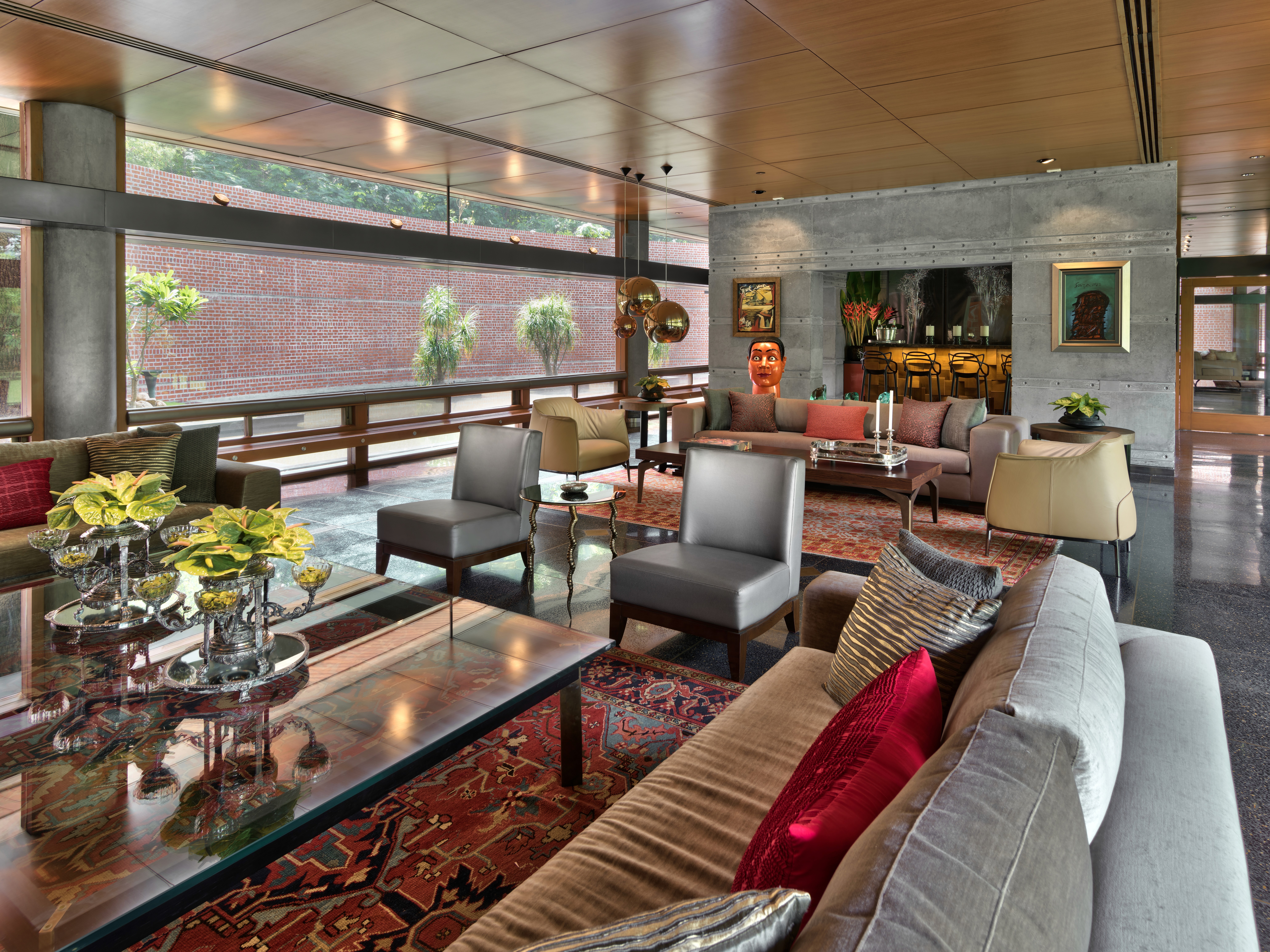 The house sits low against the horizon, its public spaces arranged on the ground floor and opening onto gardens on one side and a water body that curves gently around the property on the other. Private spaces occupy the first floor, while the overall L-shaped configuration maximises views and responds to the movement of the sun. From the outset, the design intent was contemporary and holistic—rooted in Indian sensibilities yet untethered to a specific style. The structure was intentionally expressed rather than concealed: exposed concrete walls, long stretches of brickwork, and a conical staircase connecting the two floors and sitting proudly within the entrance lobby anchor the architectural experience. These raw, tactile elements are juxtaposed with warm, finely detailed veneered ceilings, creating a dialogue between the robust and the refined.