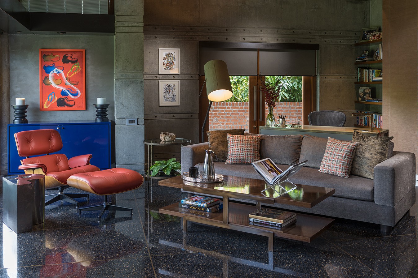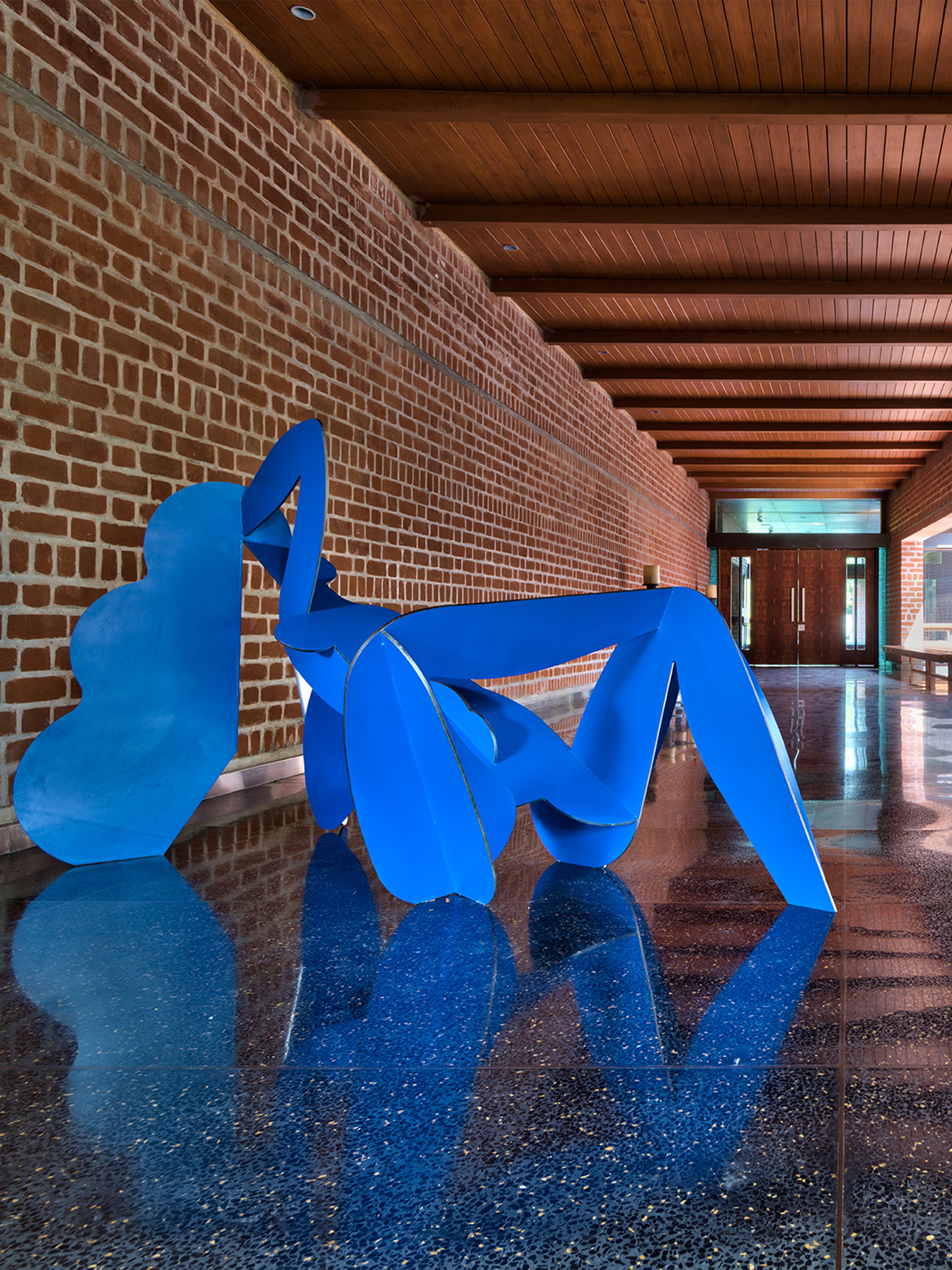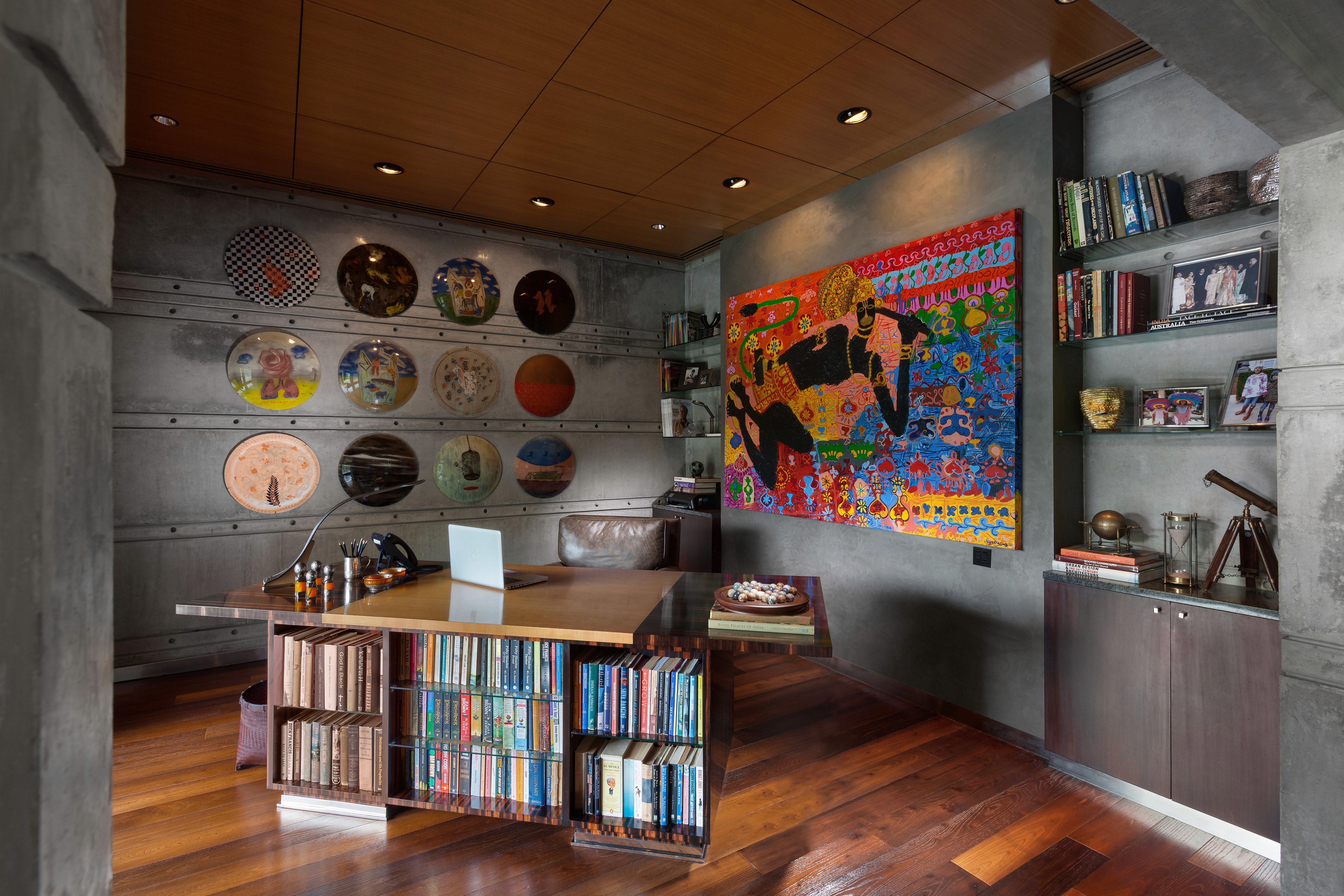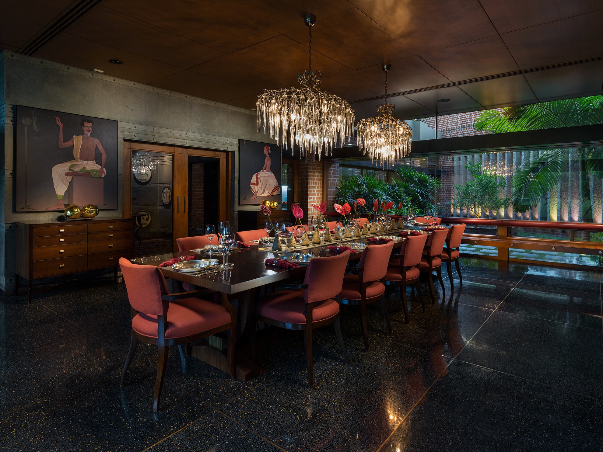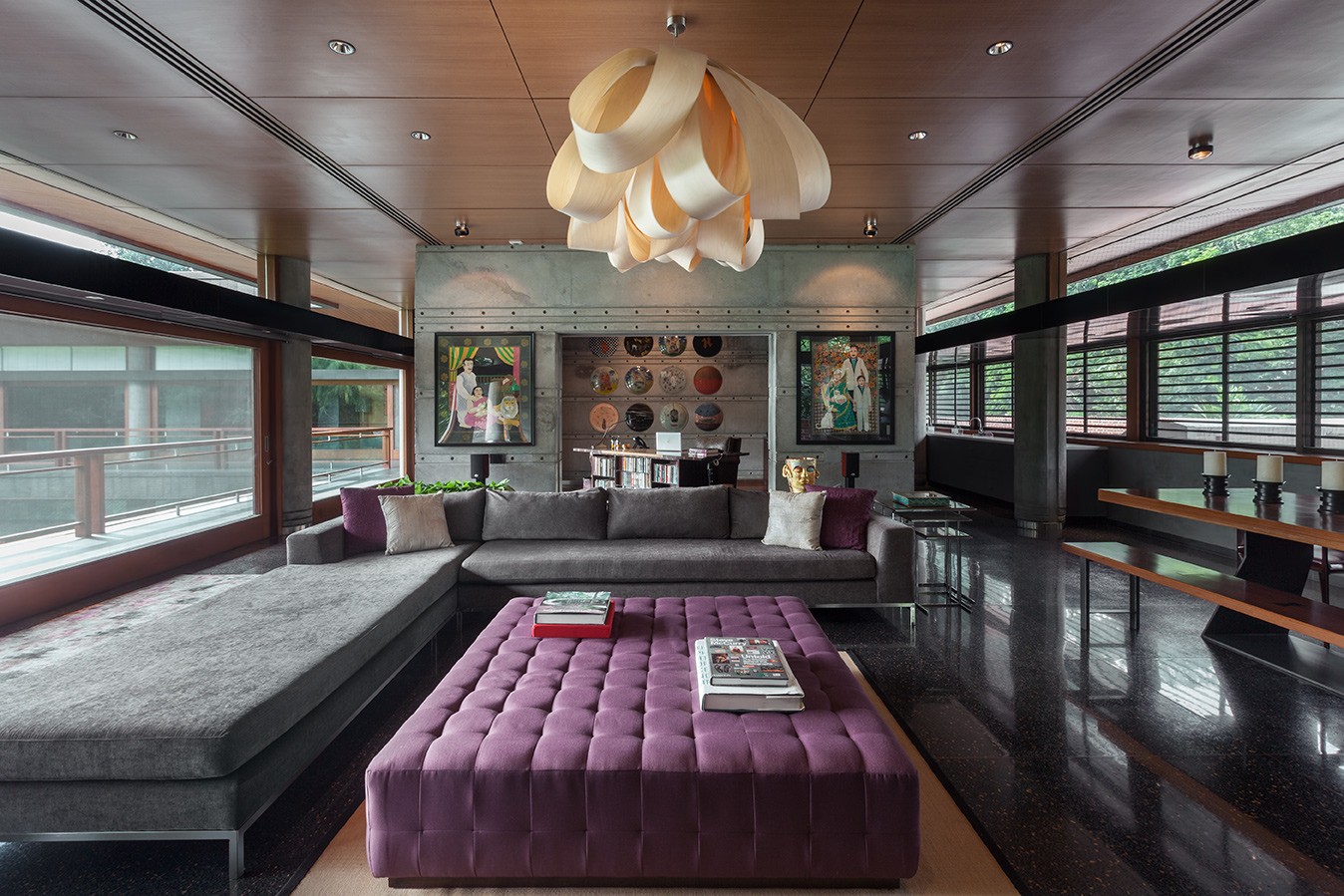 The house sits low against the horizon, its public spaces arranged on the ground floor and opening onto gardens on one side and a water body that curves gently around the property on the other. Private spaces occupy the first floor, while the overall L-shaped configuration maximises views and responds to the movement of the sun. From the outset, the design intent was contemporary and holistic—rooted in Indian sensibilities yet untethered to a specific style. The structure was intentionally expressed rather than concealed: exposed concrete walls, long stretches of brickwork, and a conical staircase connecting the two floors and sitting proudly within the entrance lobby anchor the architectural experience. These raw, tactile elements are juxtaposed with warm, finely detailed veneered ceilings, creating a dialogue between the robust and the refined.