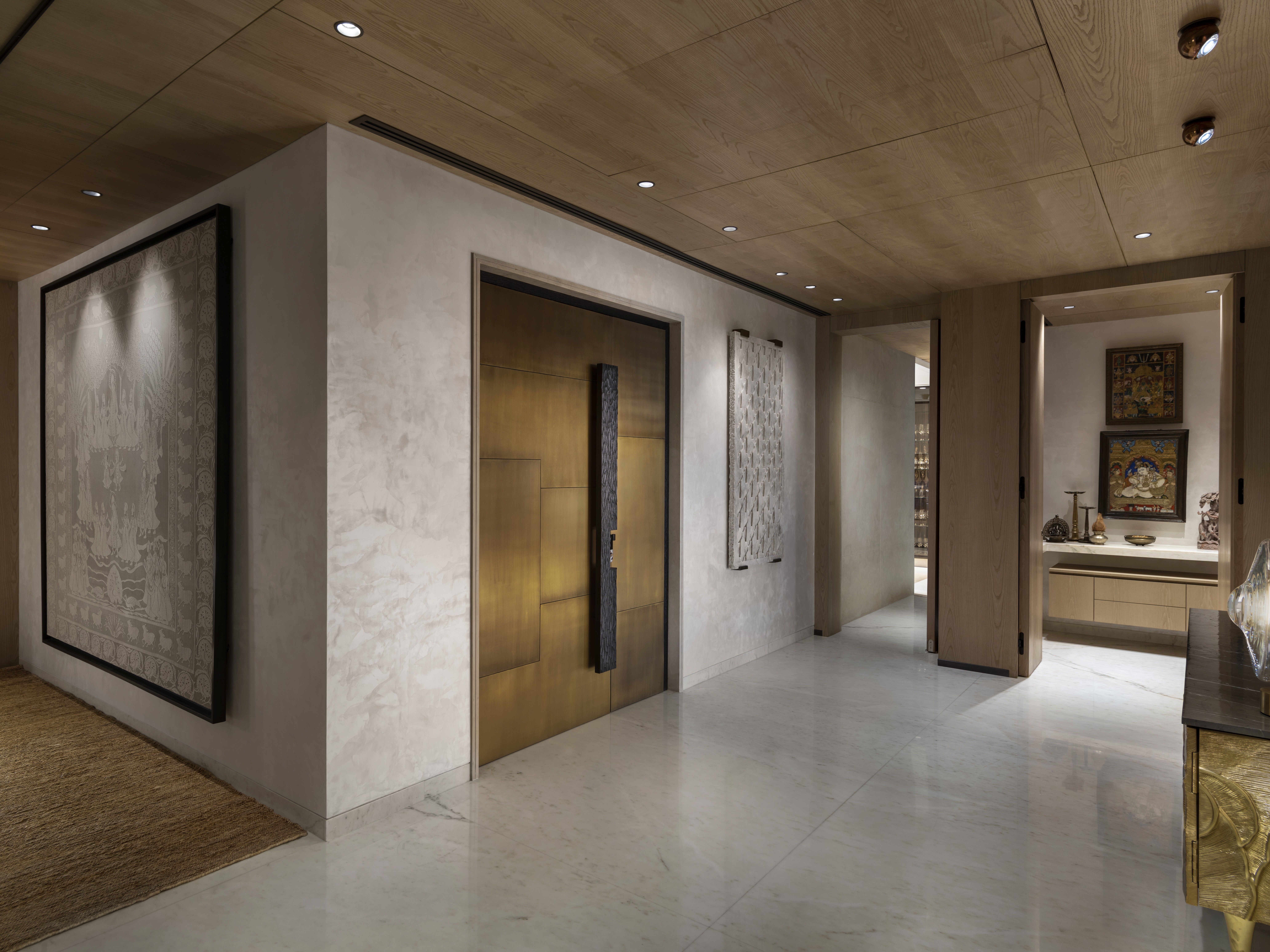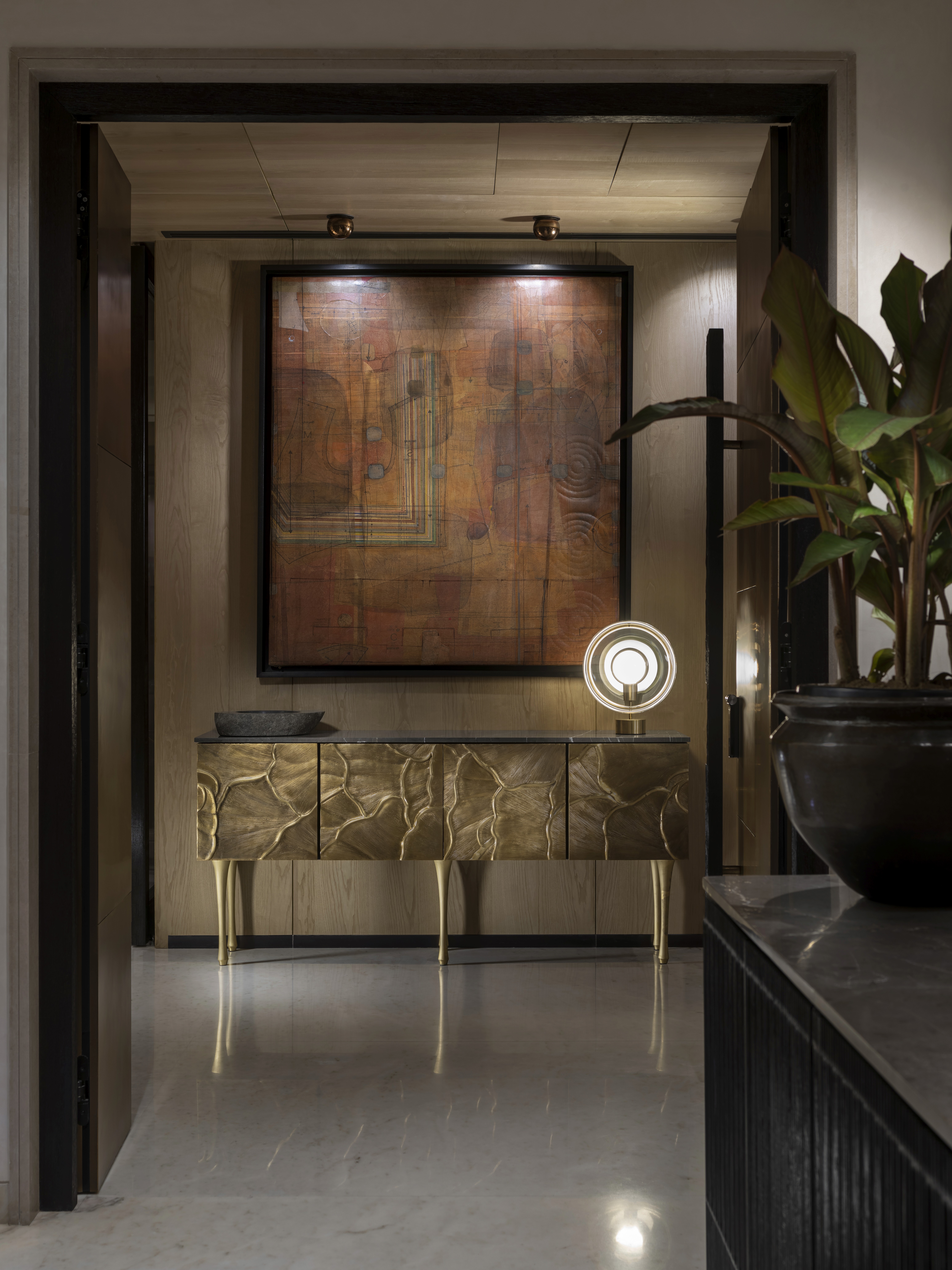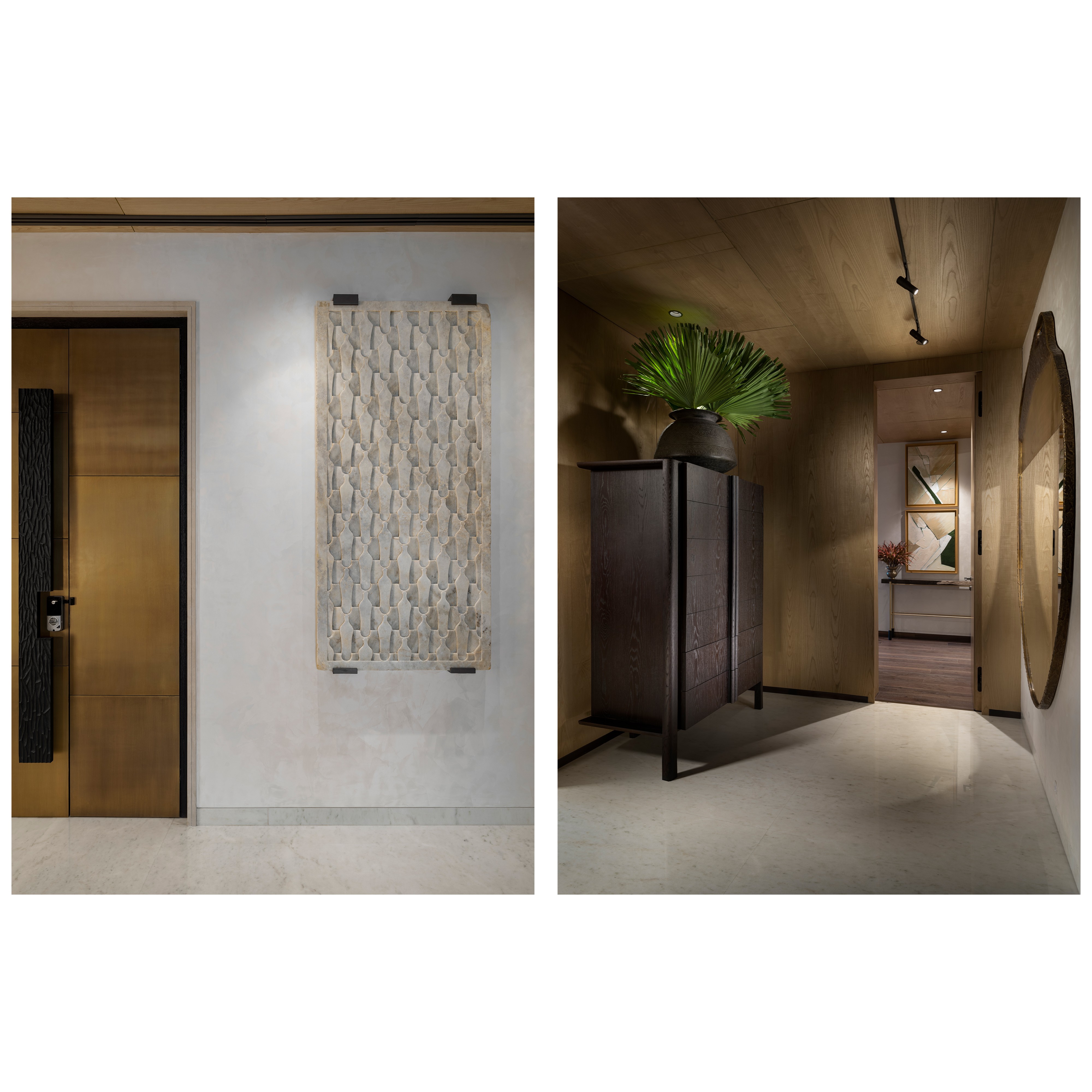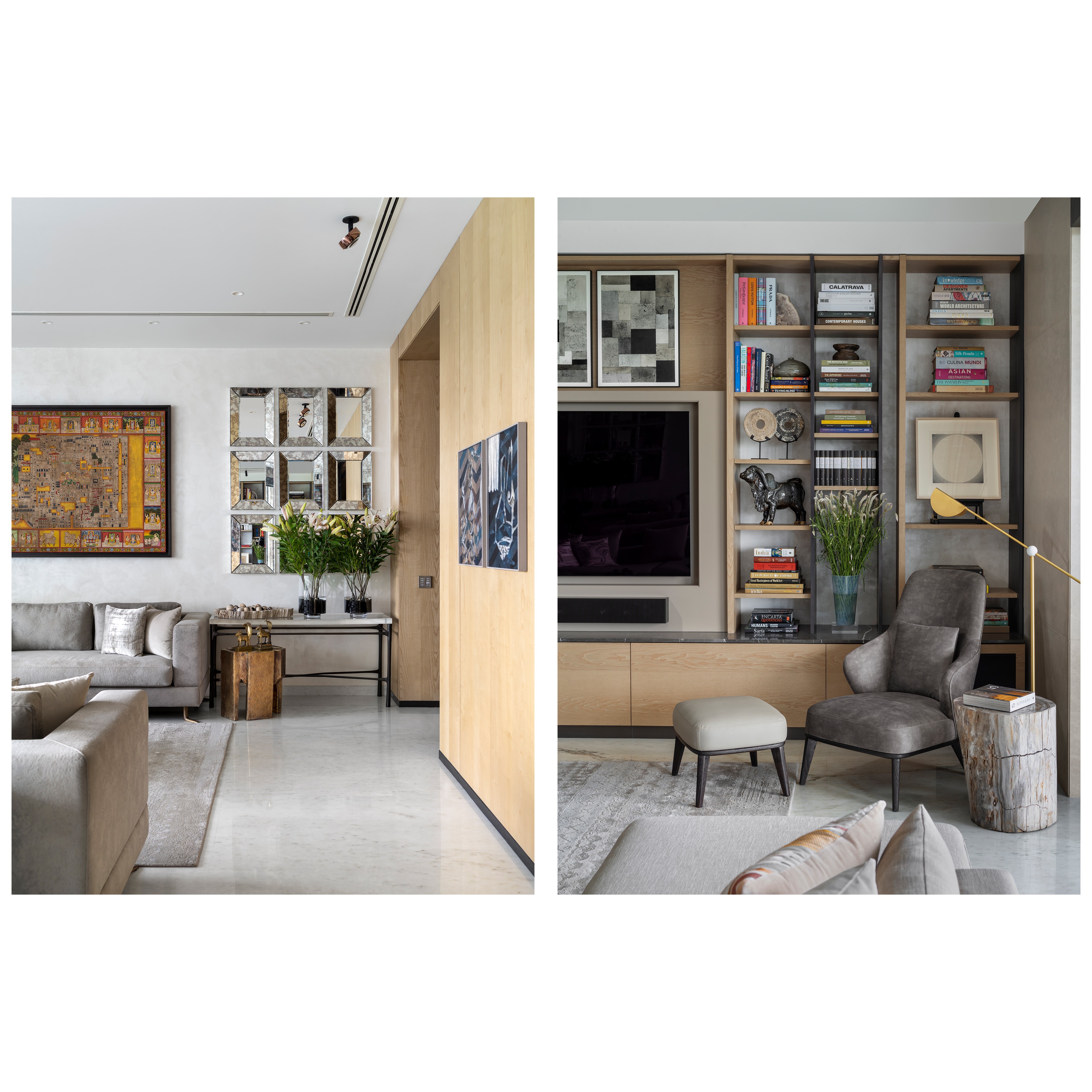 This apartment is a second home for a family of four whose primary residence is in Wimbledon, UK. Their brief called for a contemporary residence that retained an Indian sensibility—an environment shaped by their affinity for travel, art, and cultural memory. The design language is rooted in material clarity. Layered hard finishes, honed textures, and woven textiles establish a quiet but sophisticated architectural tonality. The spatial organisation centres on a generous entrance lobby, conceived as the primary node from which all public and private rooms, including four bedrooms, radiate. This planning strategy creates a coherent spatial narrative and a sense of deliberate arrival.