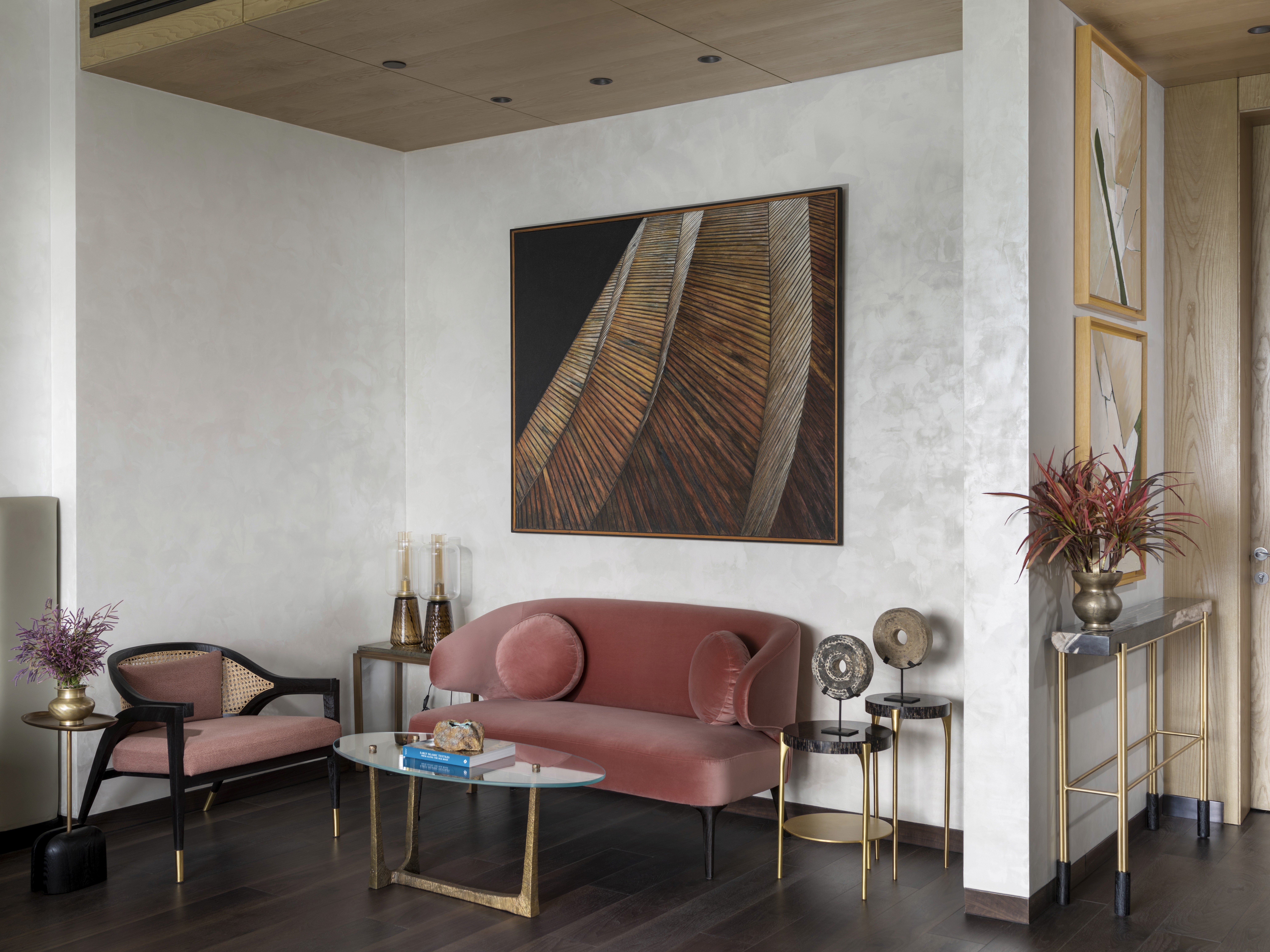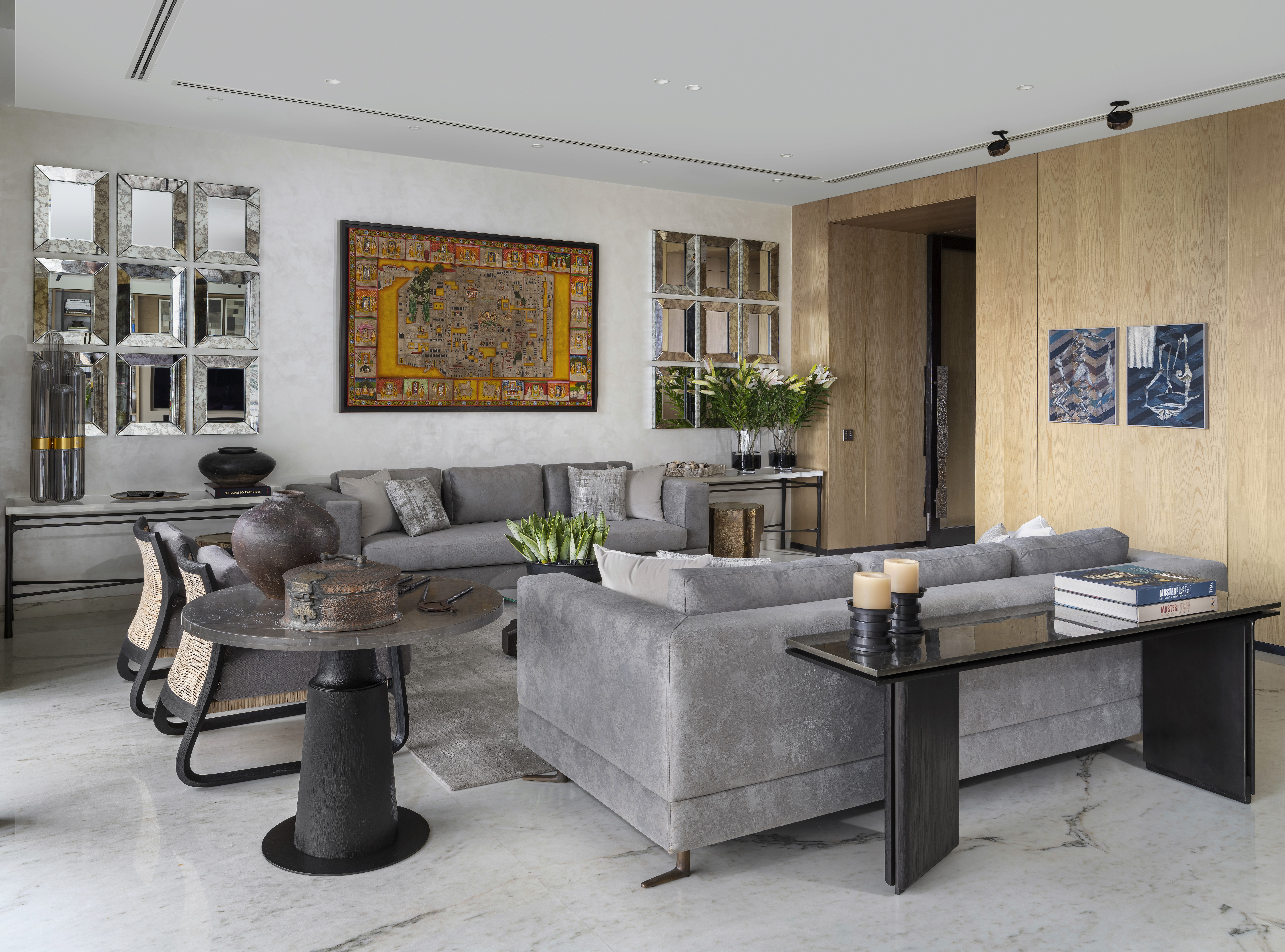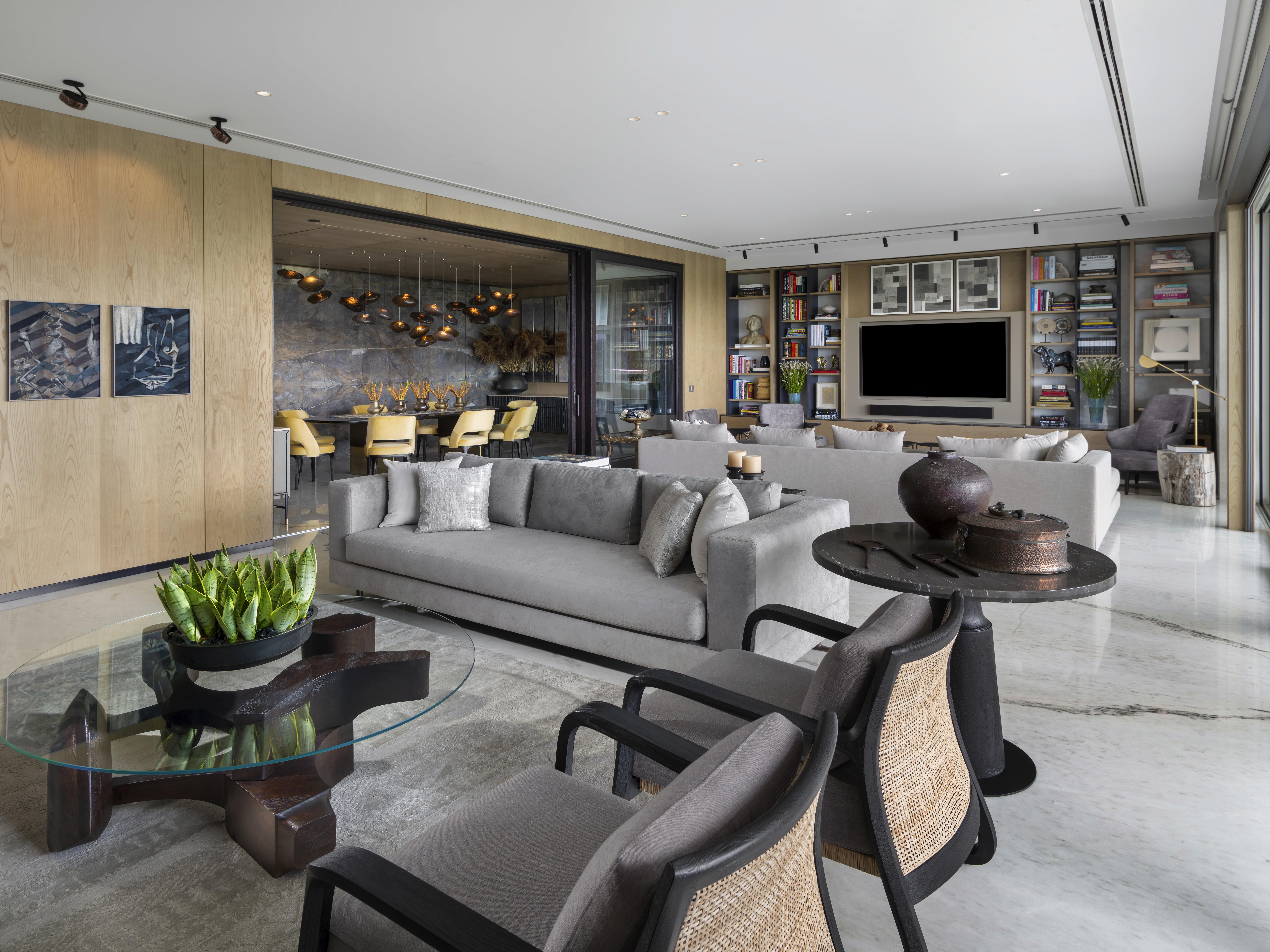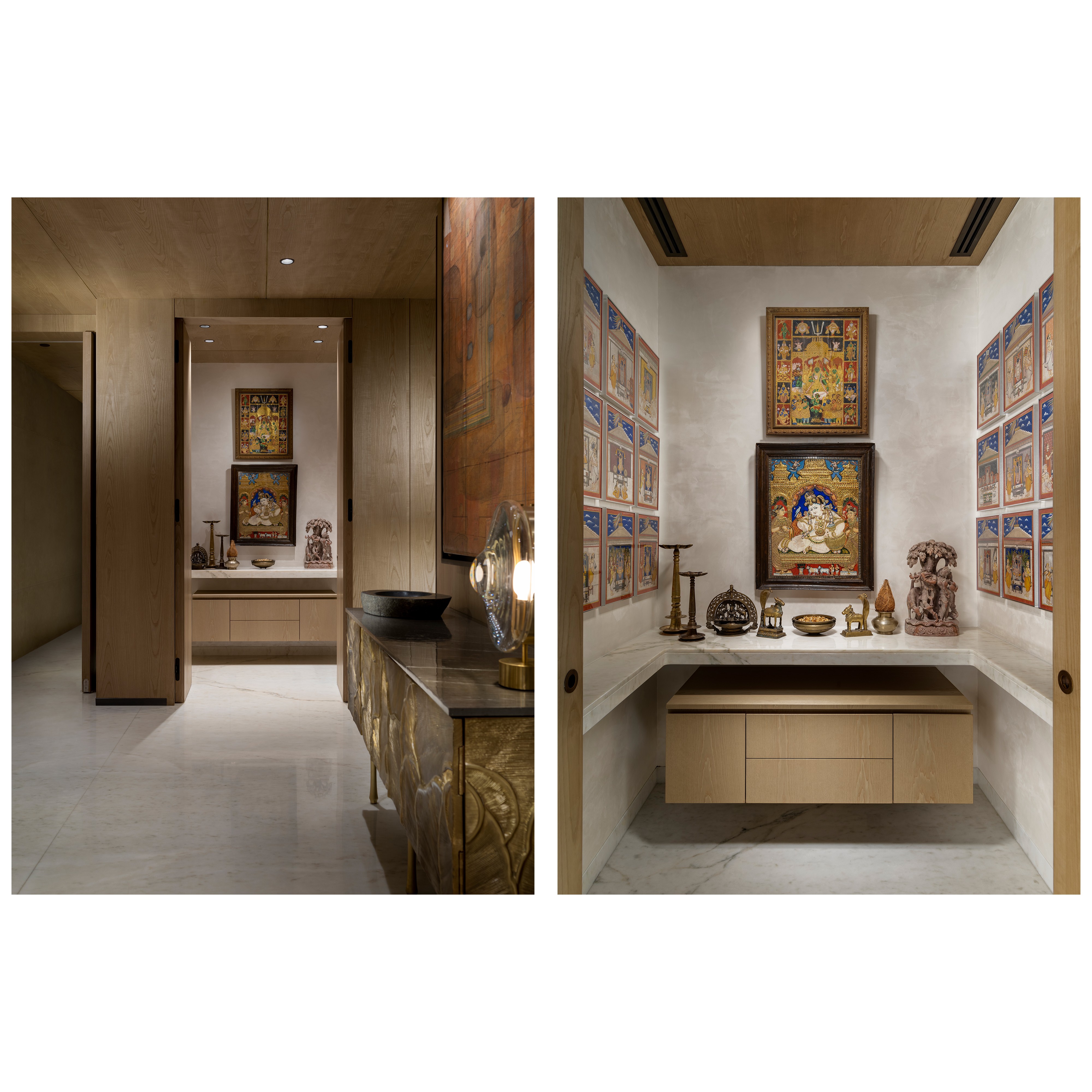 This apartment is a second home for a family of four whose primary residence is in Wimbledon, UK. Their brief called for a contemporary residence that retained an Indian sensibility—an environment shaped by their affinity for travel, art, and cultural memory. The design language is rooted in material clarity. Layered hard finishes, honed textures, and woven textiles establish a quiet but sophisticated architectural tonality. The spatial organisation centres on a generous entrance lobby, conceived as the primary node from which all public and private rooms, including four bedrooms, radiate. This planning strategy creates a coherent spatial narrative and a sense of deliberate arrival.