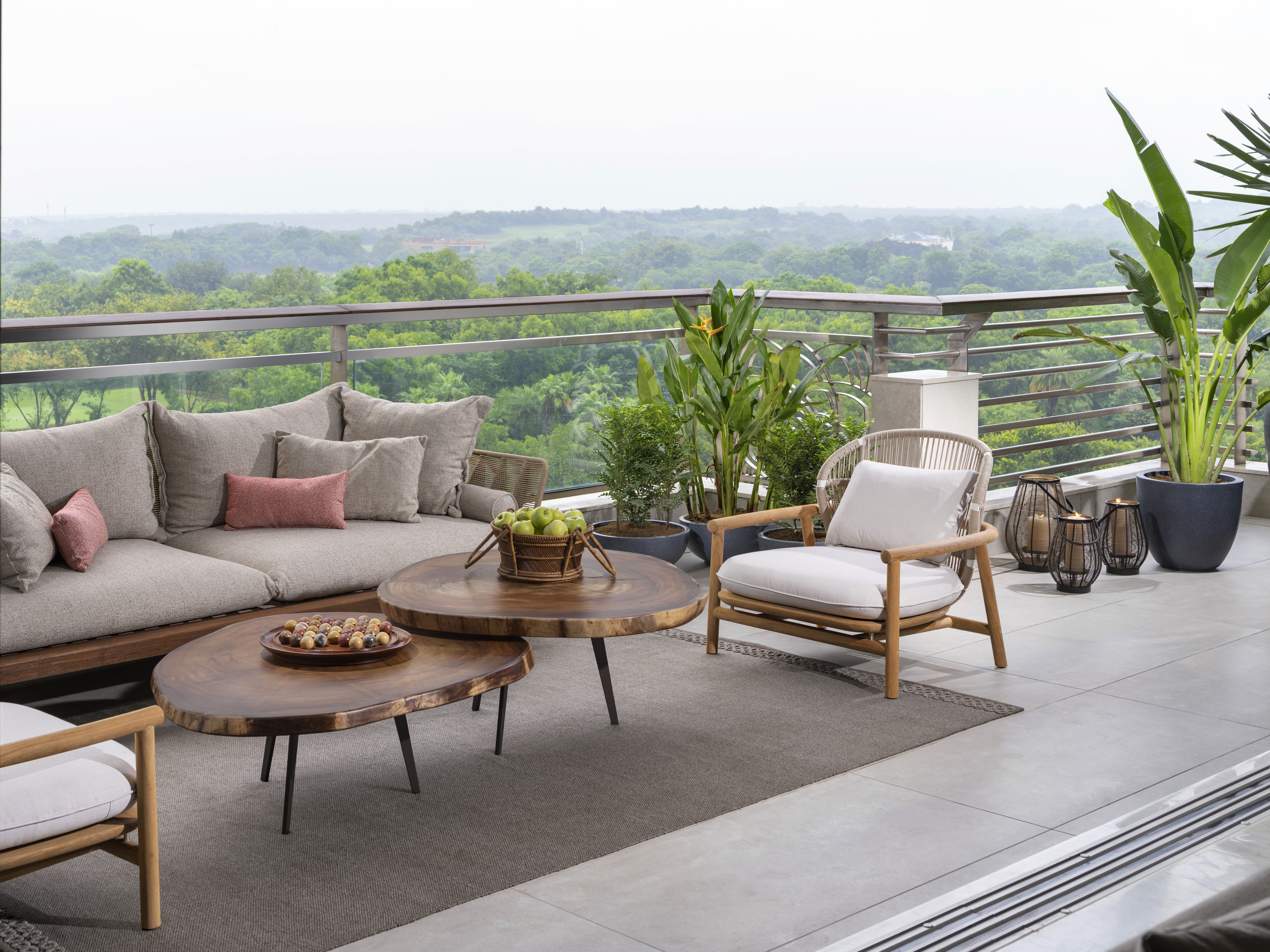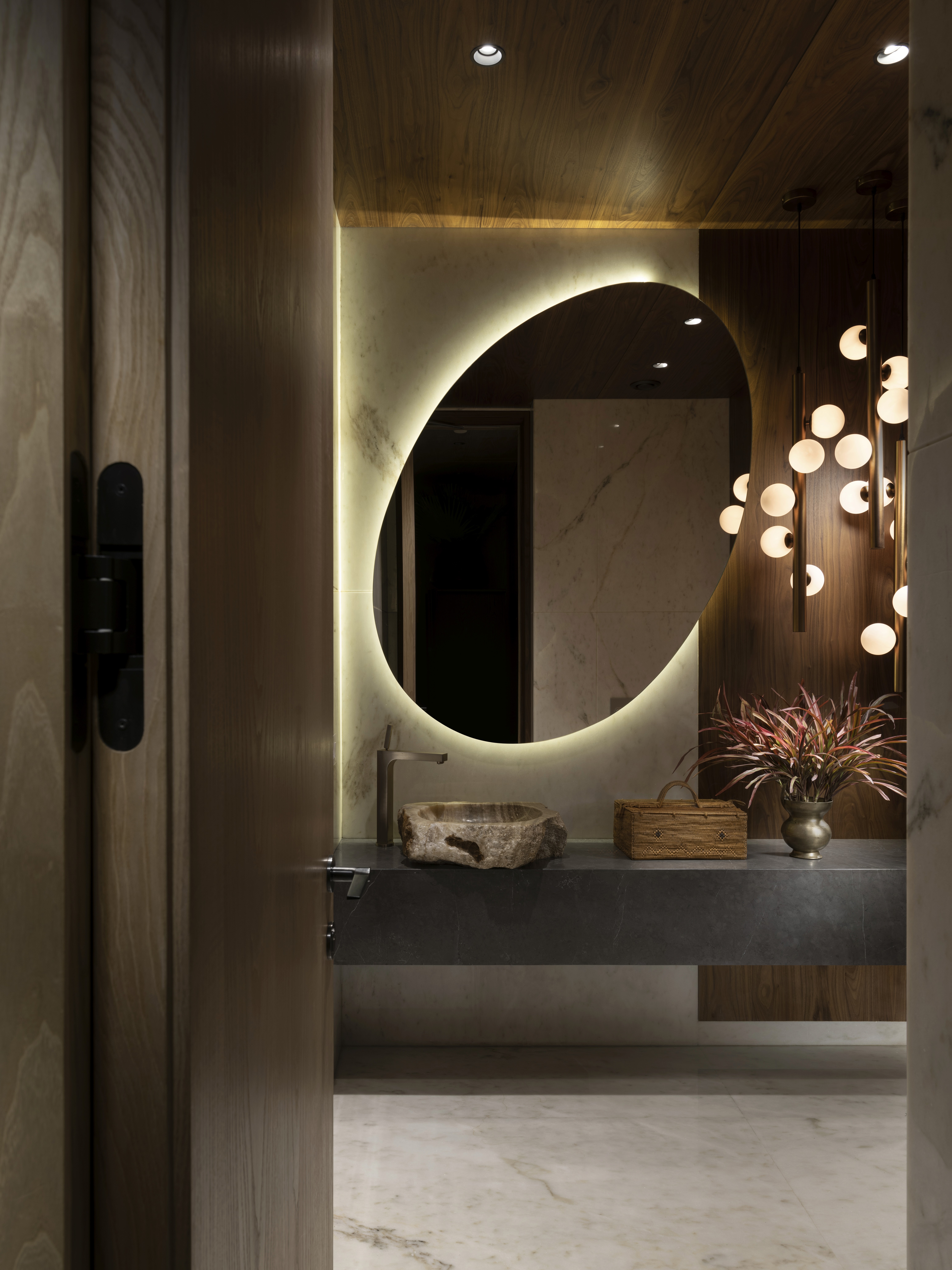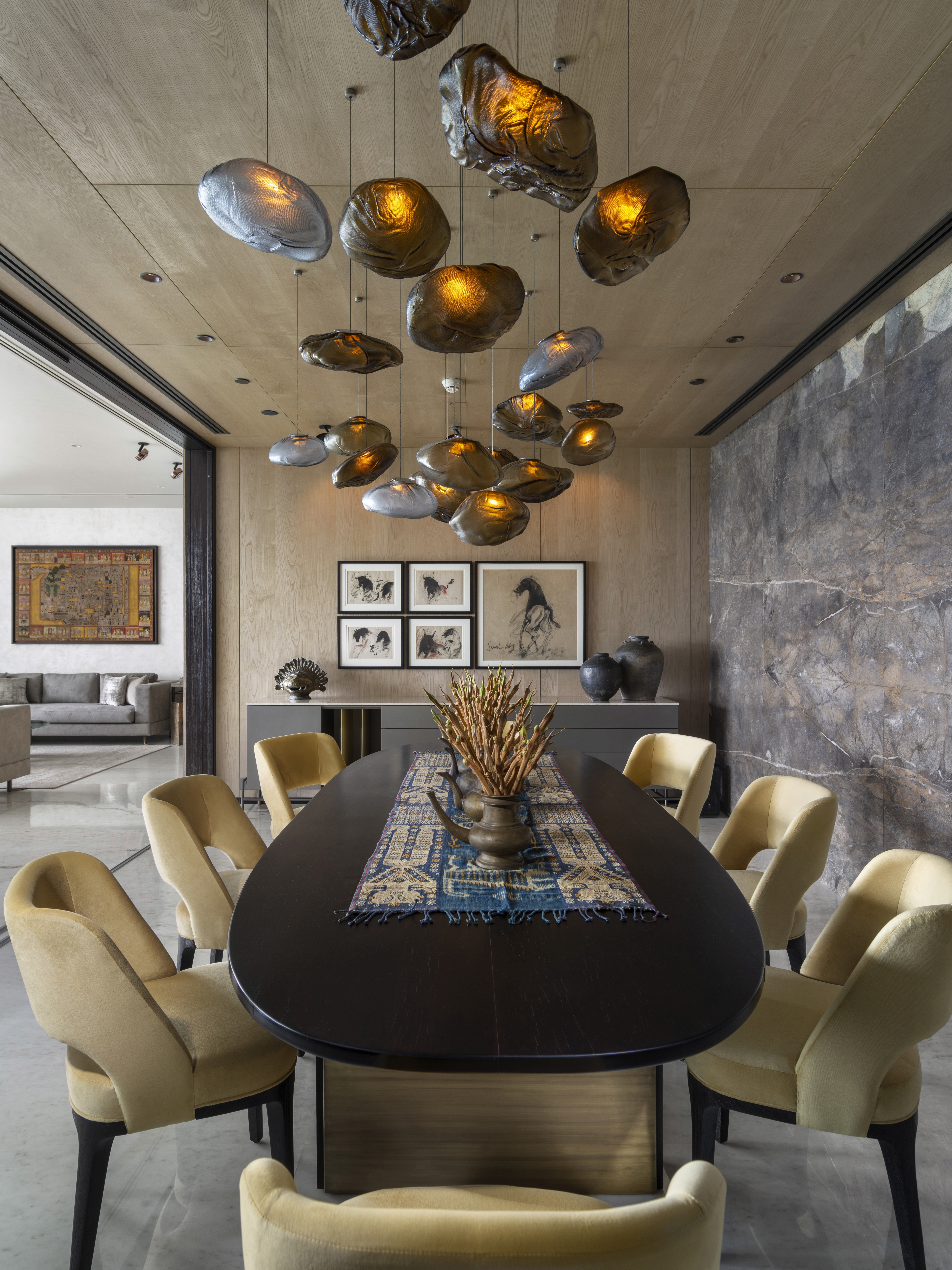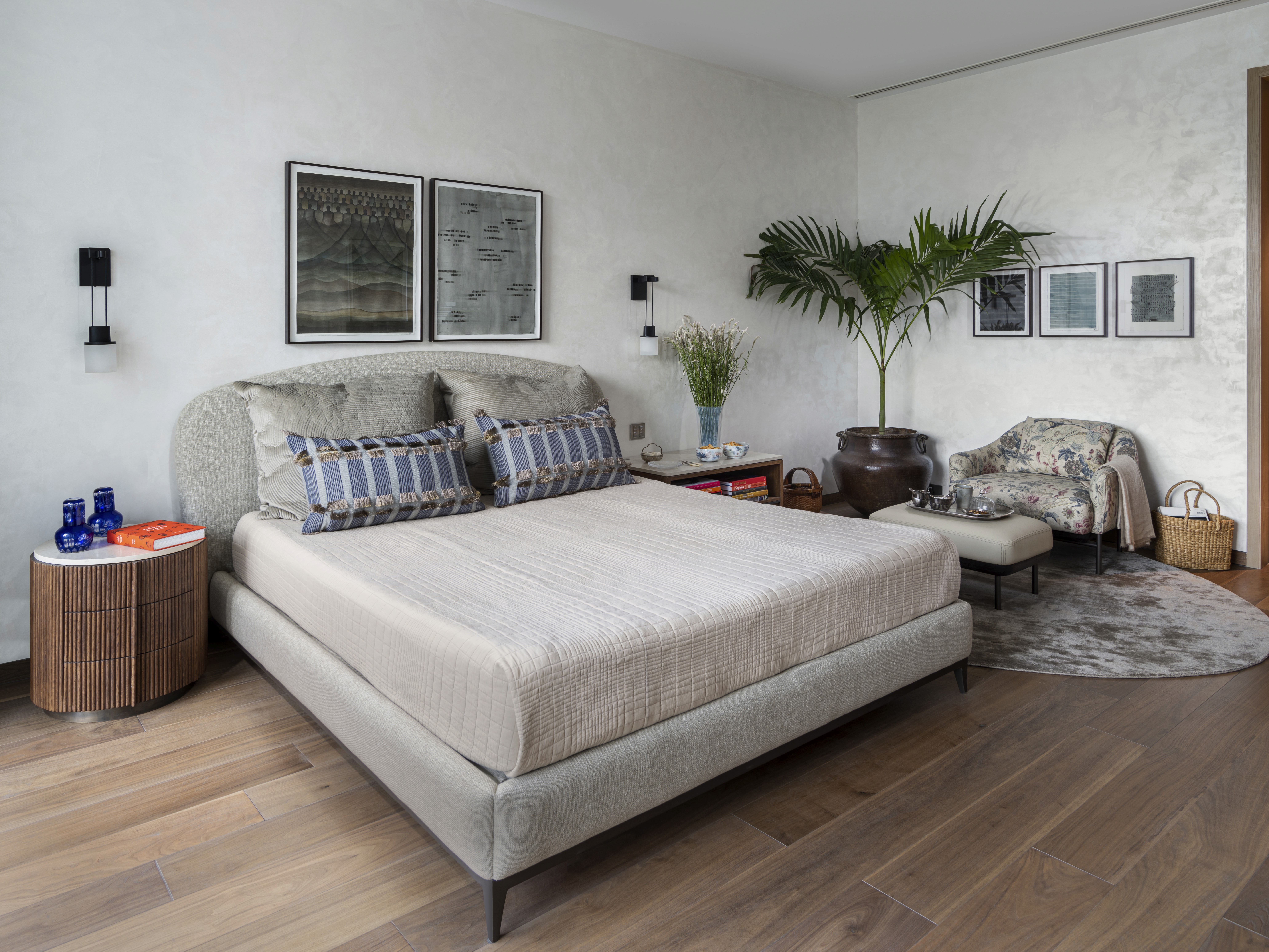 This apartment is a second home for a family of four whose primary residence is in Wimbledon, UK. Their brief called for a contemporary residence that retained an Indian sensibility—an environment shaped by their affinity for travel, art, and cultural memory. The design language is rooted in material clarity. Layered hard finishes, honed textures, and woven textiles establish a quiet but sophisticated architectural tonality. The spatial organisation centres on a generous entrance lobby, conceived as the primary node from which all public and private rooms, including four bedrooms, radiate. This planning strategy creates a coherent spatial narrative and a sense of deliberate arrival.
