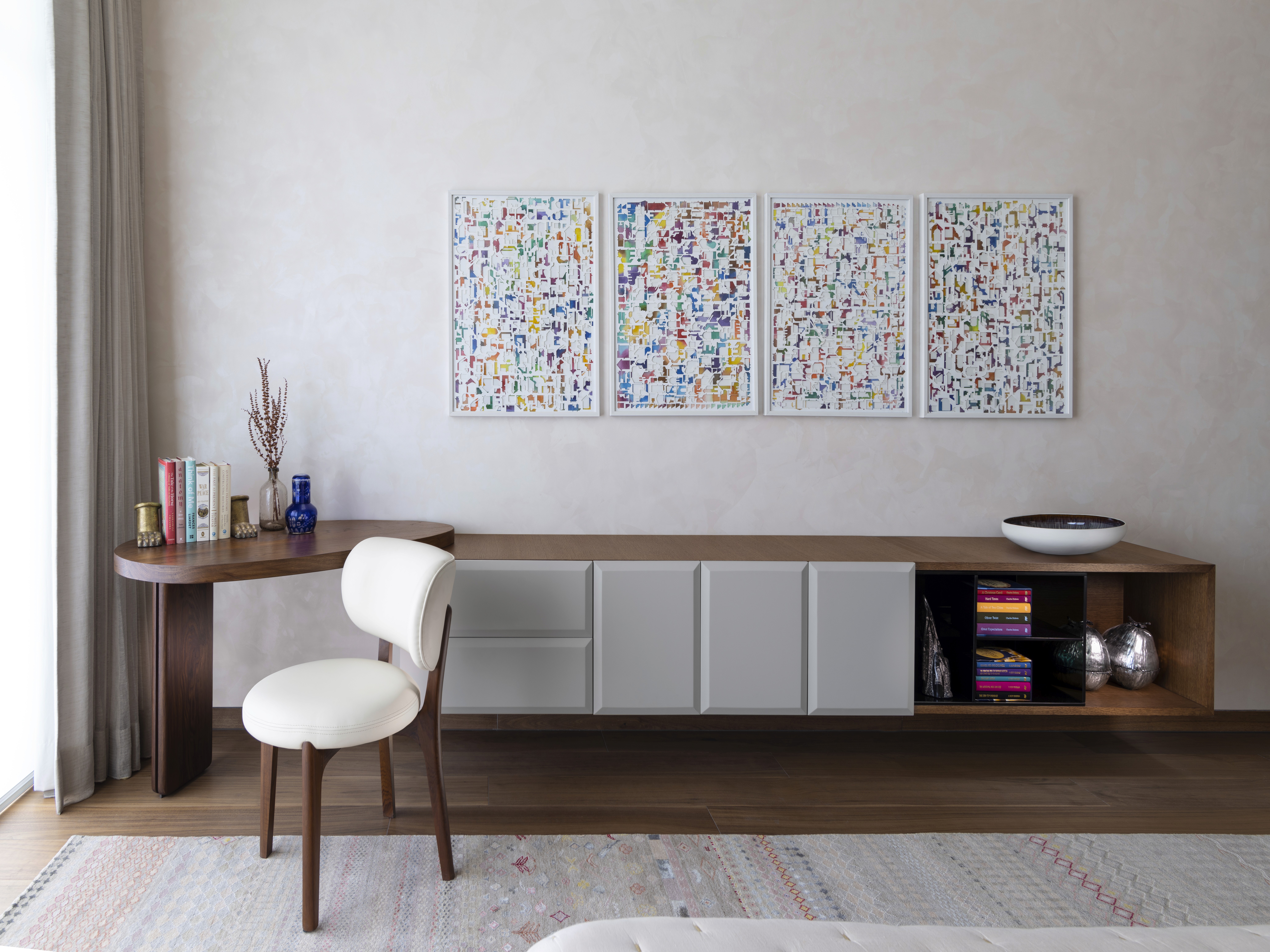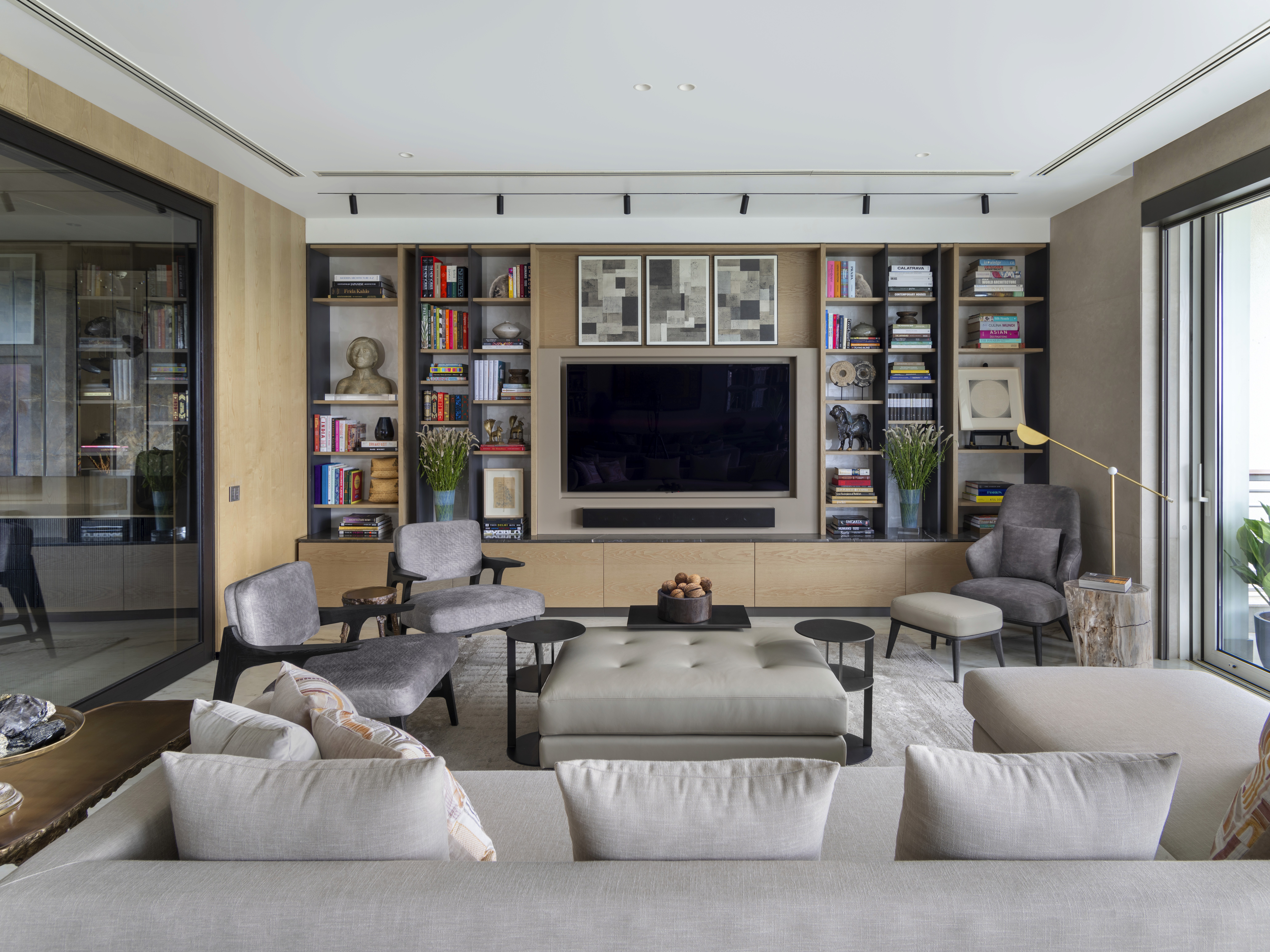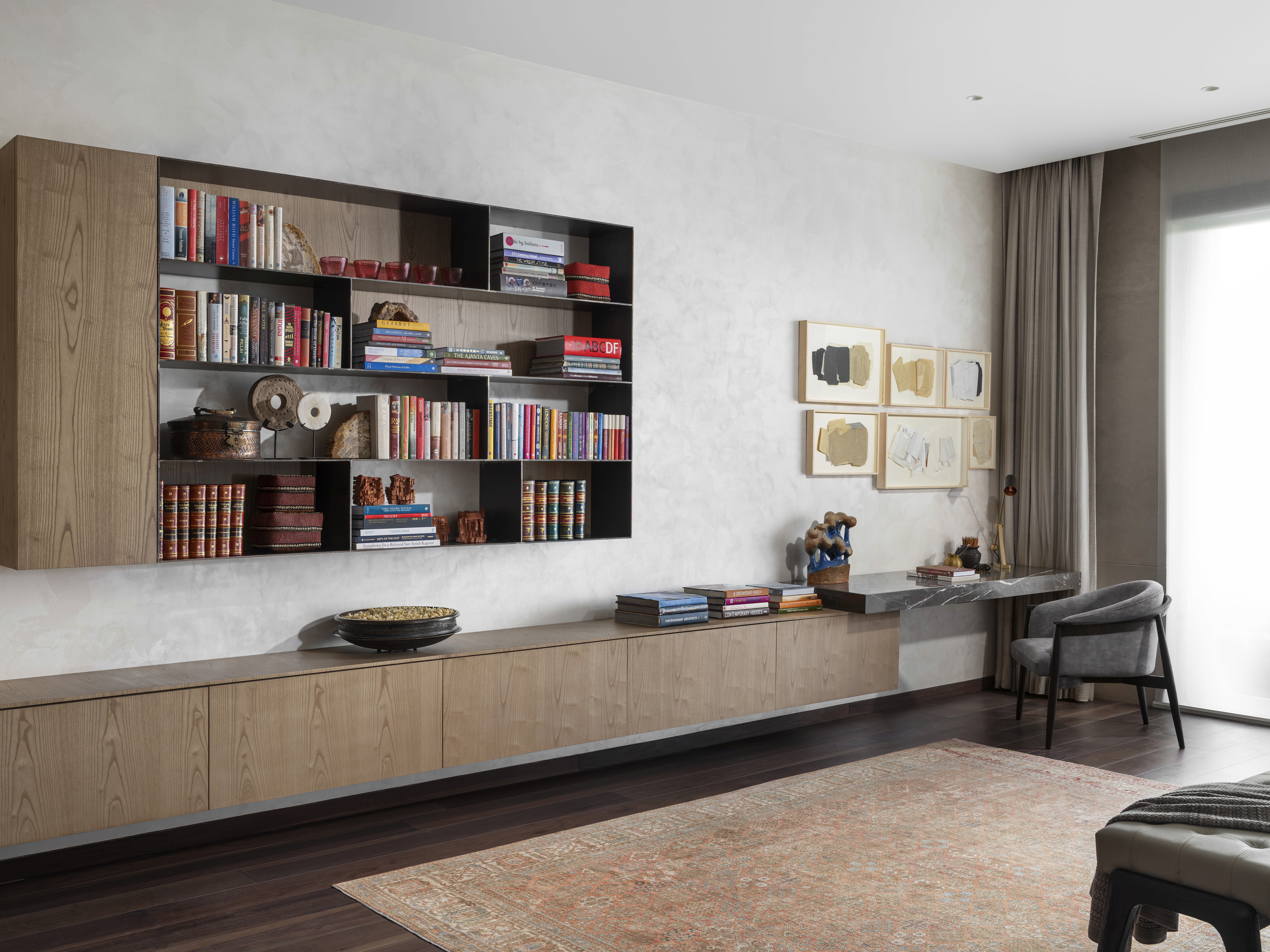 A restrained palette of neutral monochromes forms the architectural base, punctuated by art, books, and considered upholstery. All furniture was designed in-house, employing inventive material juxtapositions and meticulous detailing to achieve a cohesive visual and tactile continuity throughout the home.