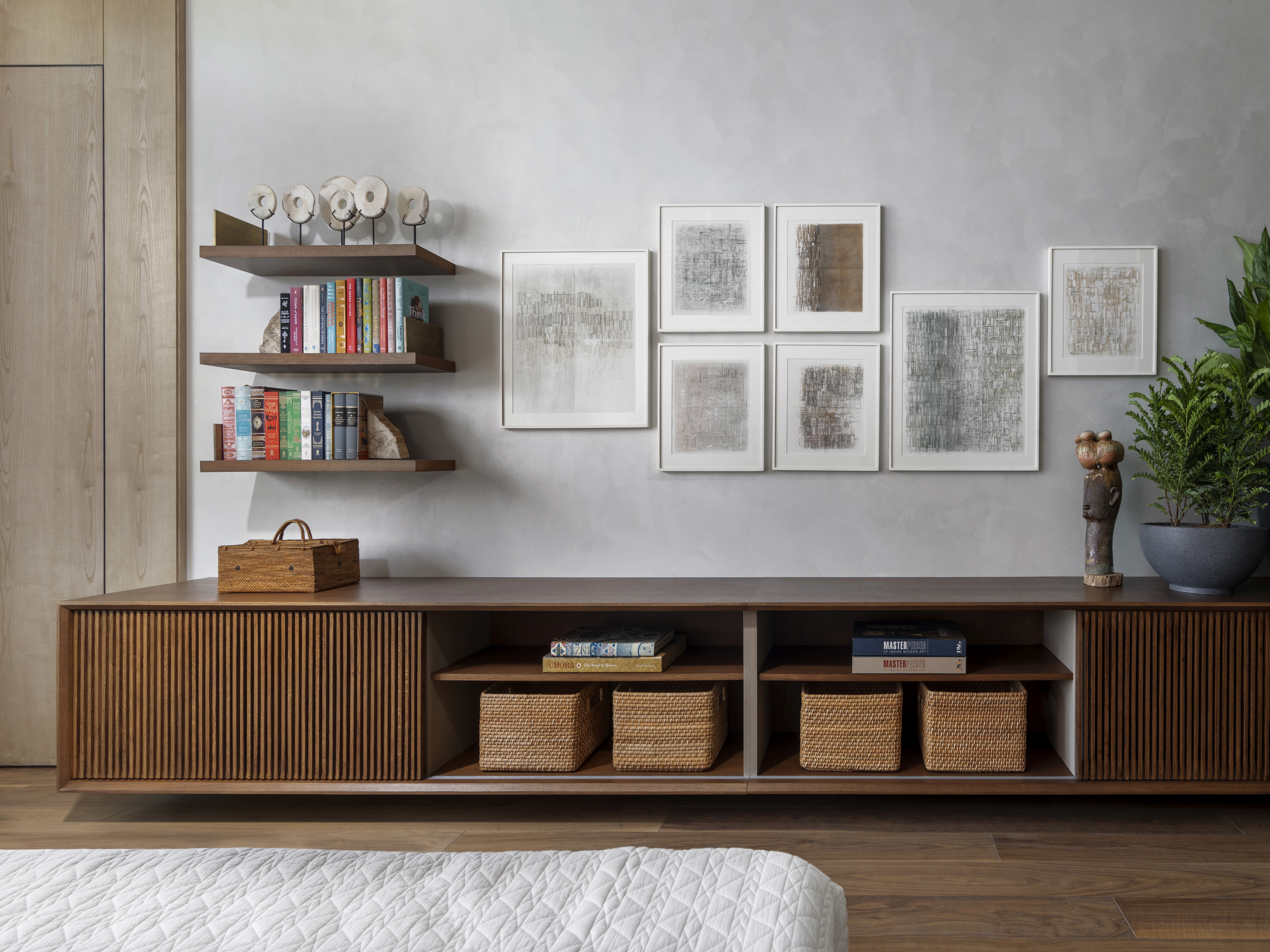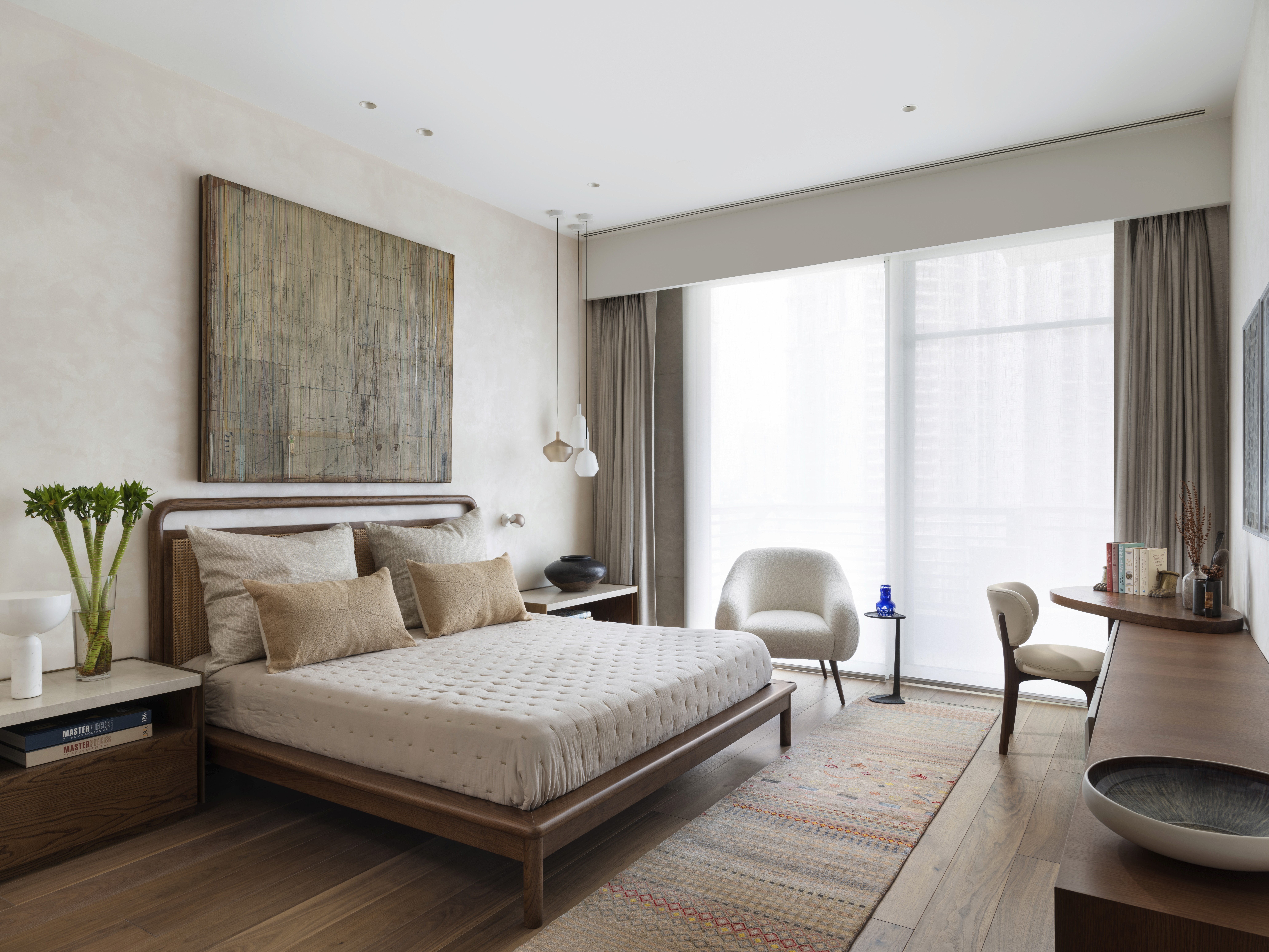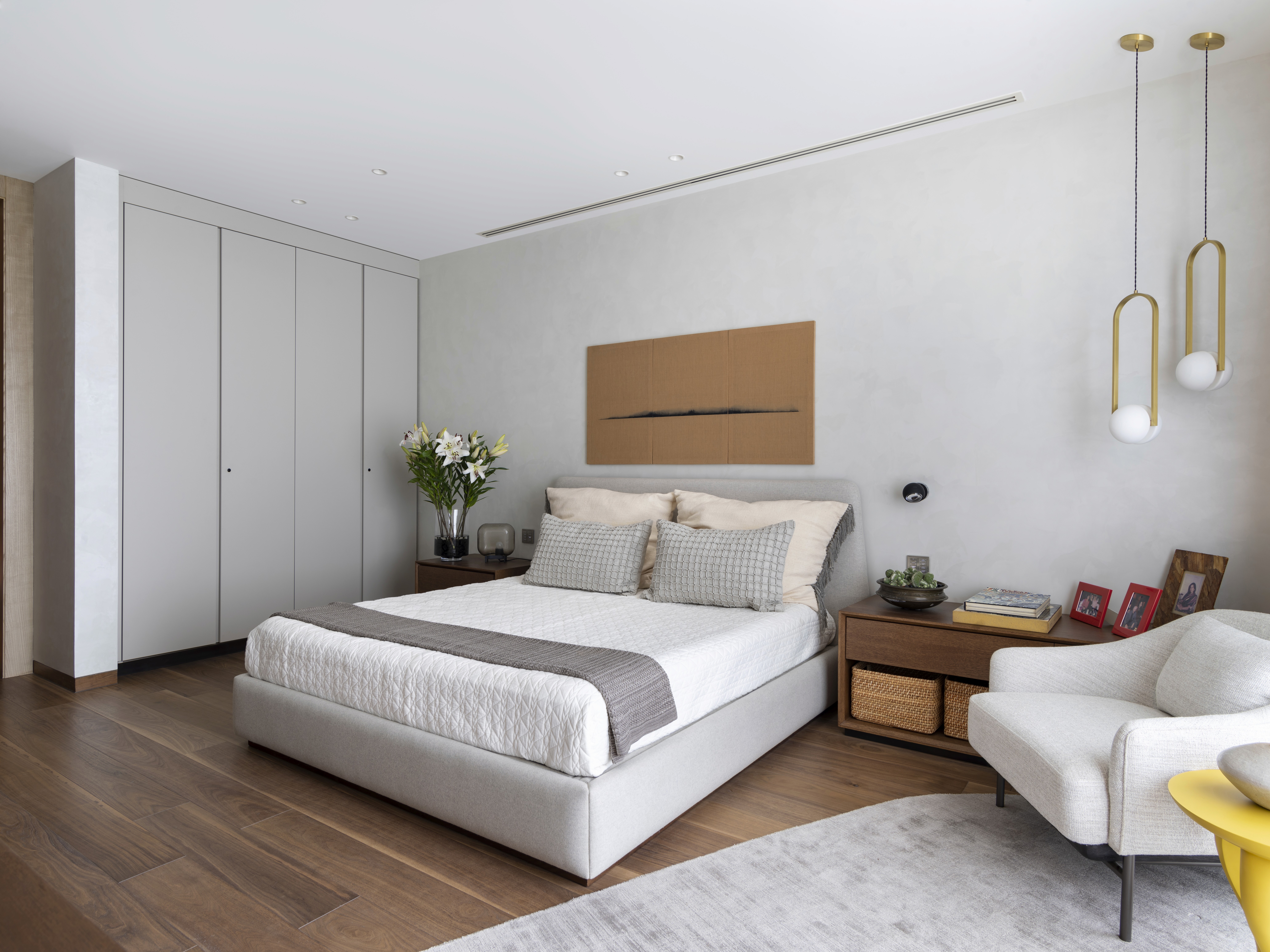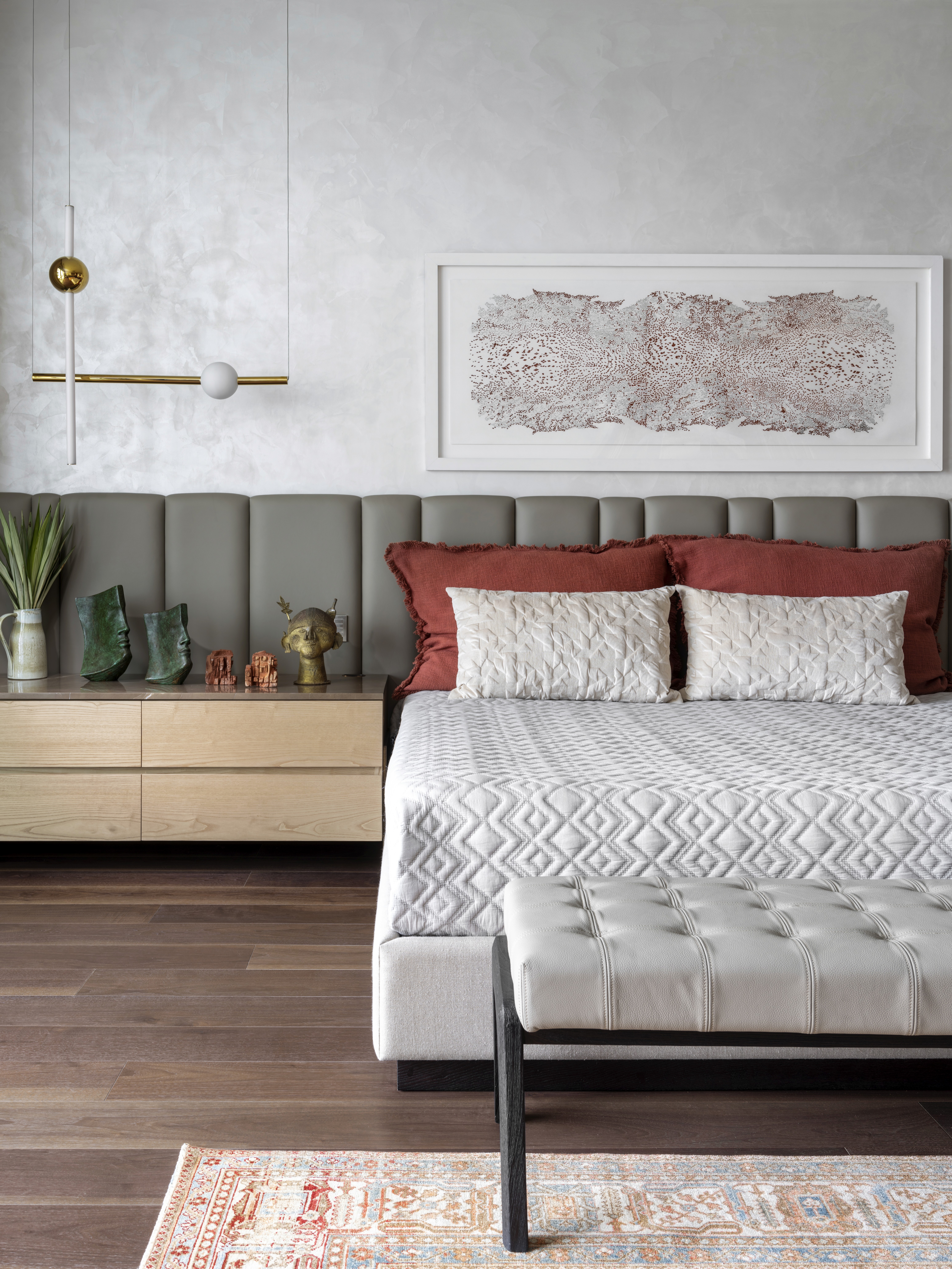 A restrained palette of neutral monochromes forms the architectural base, punctuated by art, books, and considered upholstery. All furniture was designed in-house, employing inventive material juxtapositions and meticulous detailing to achieve a cohesive visual and tactile continuity throughout the home.