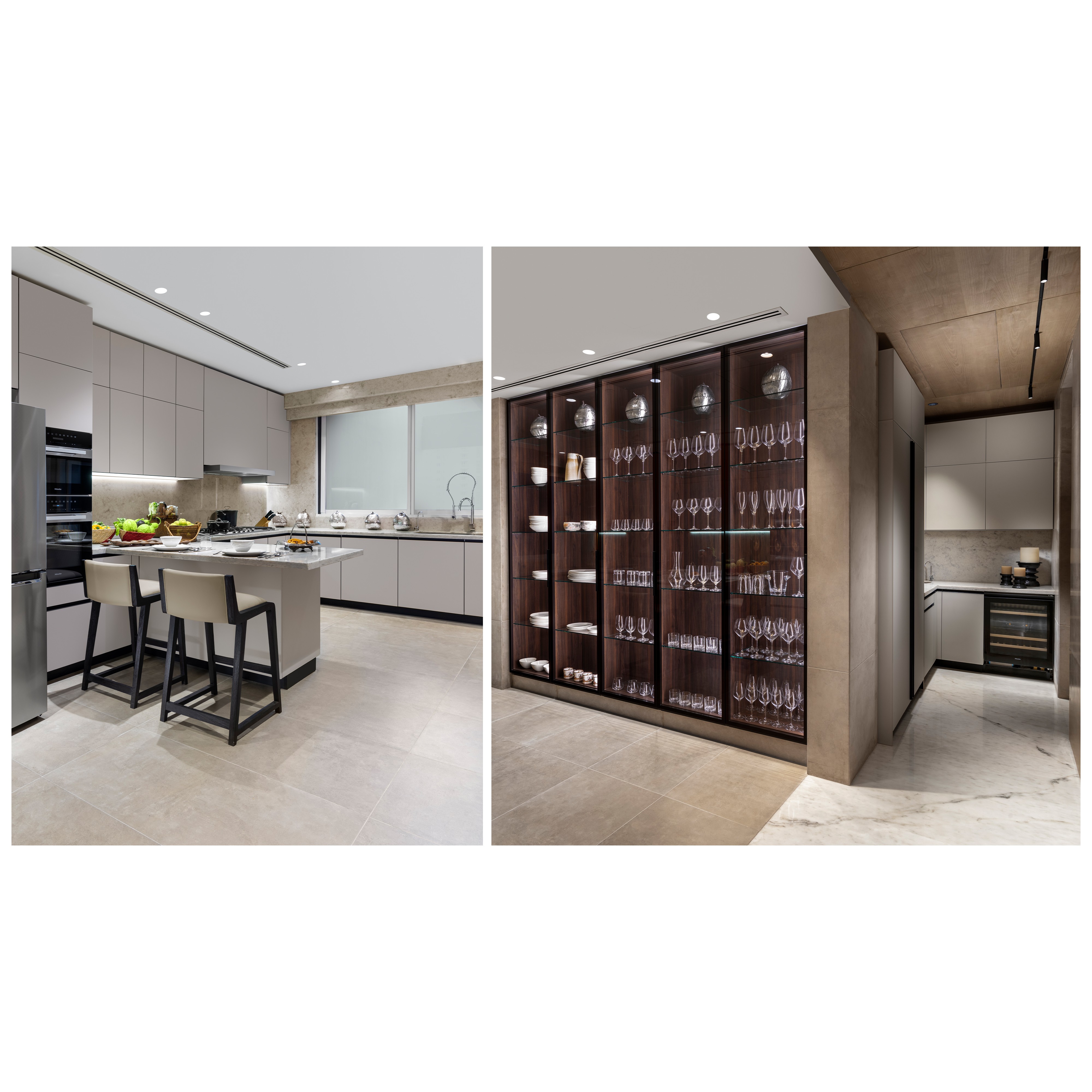 The living and dining areas function as a single, adaptable volume. Ceiling-height glass shutters allow the zone to modulate between an expansive space for entertaining and a more contained family setting. Daylight filters deep into the apartment, while unobstructed views of landscaped greens and golf courses extend the interior outward, reinforcing openness and visual calm.