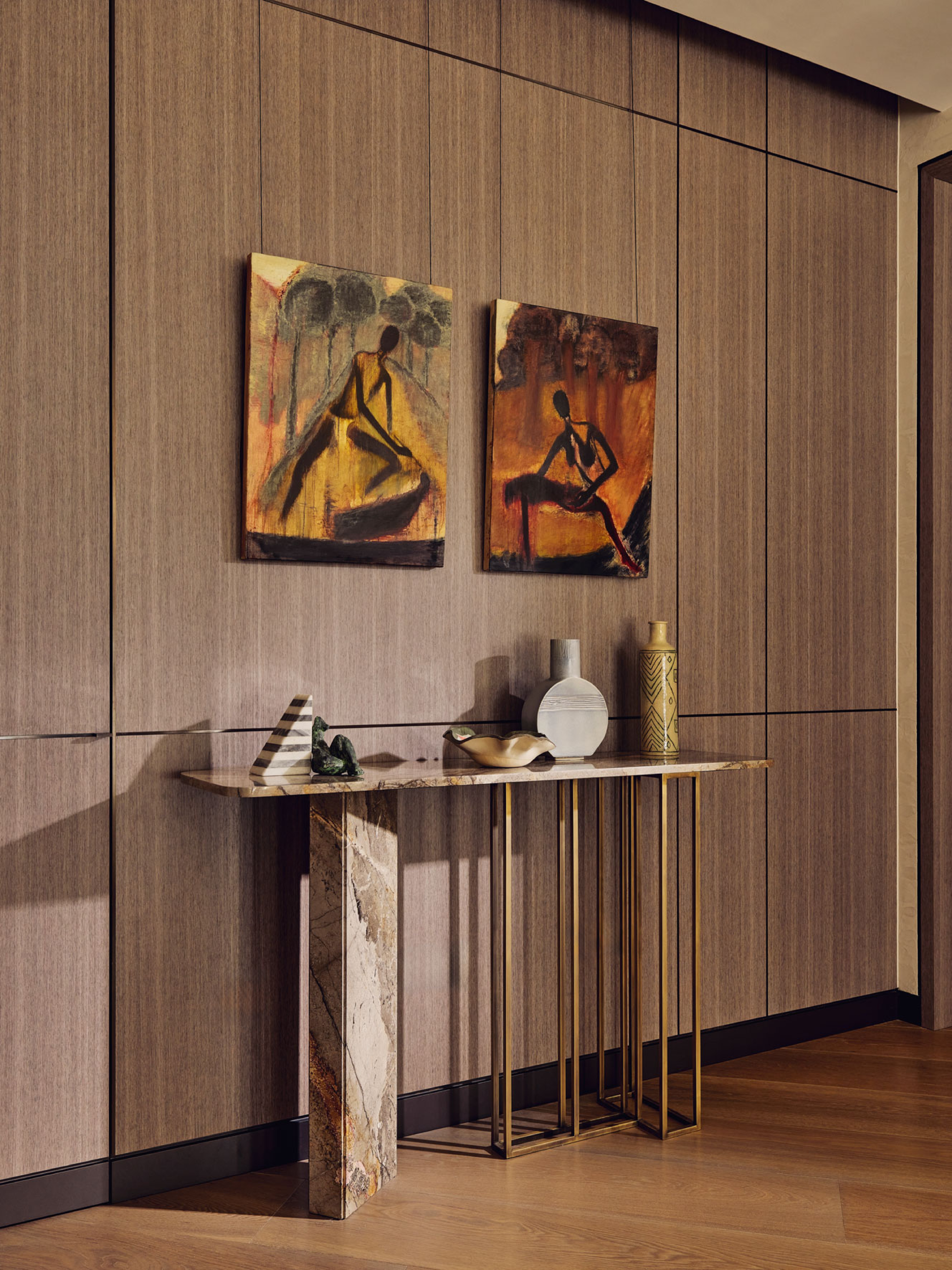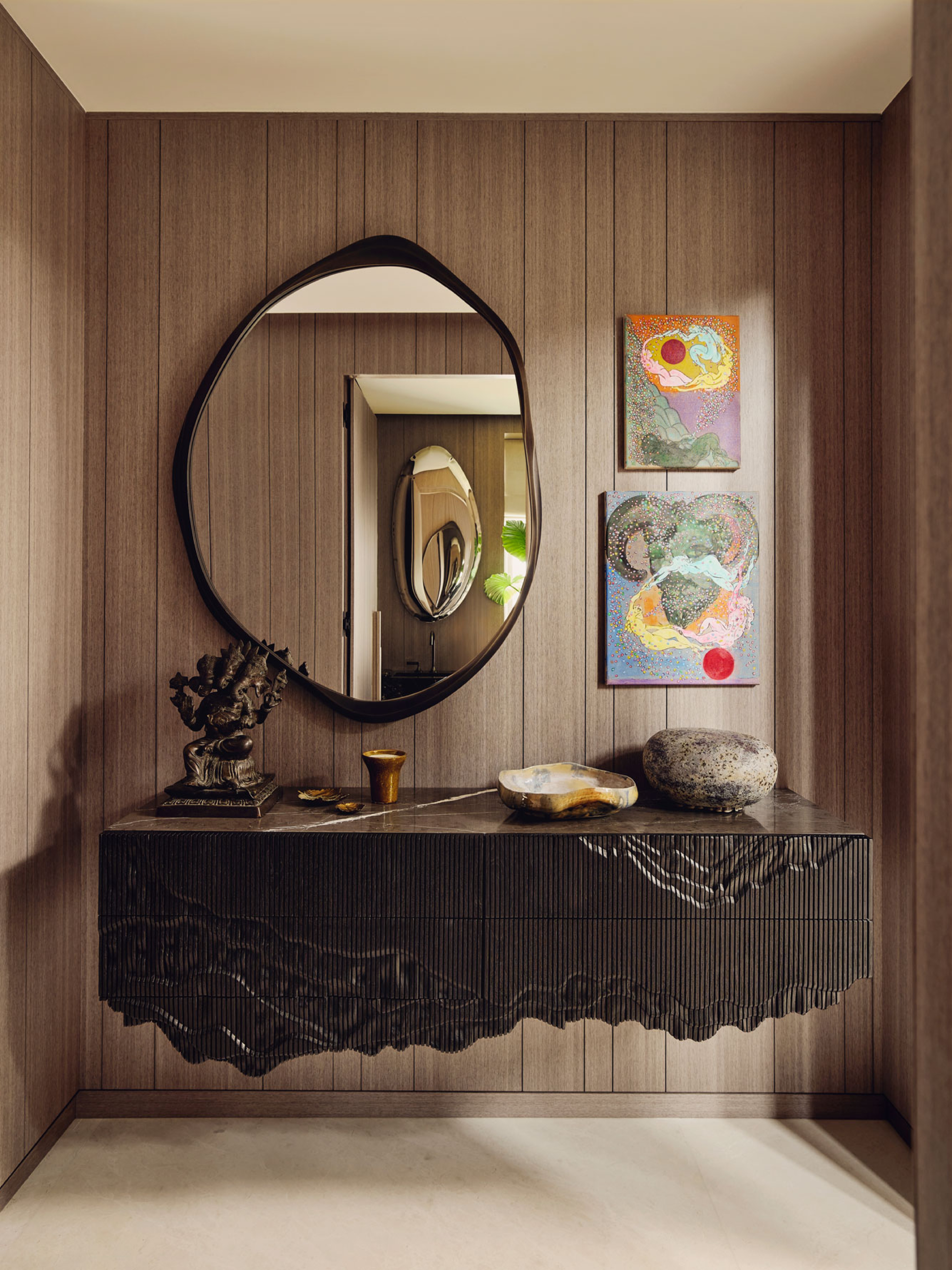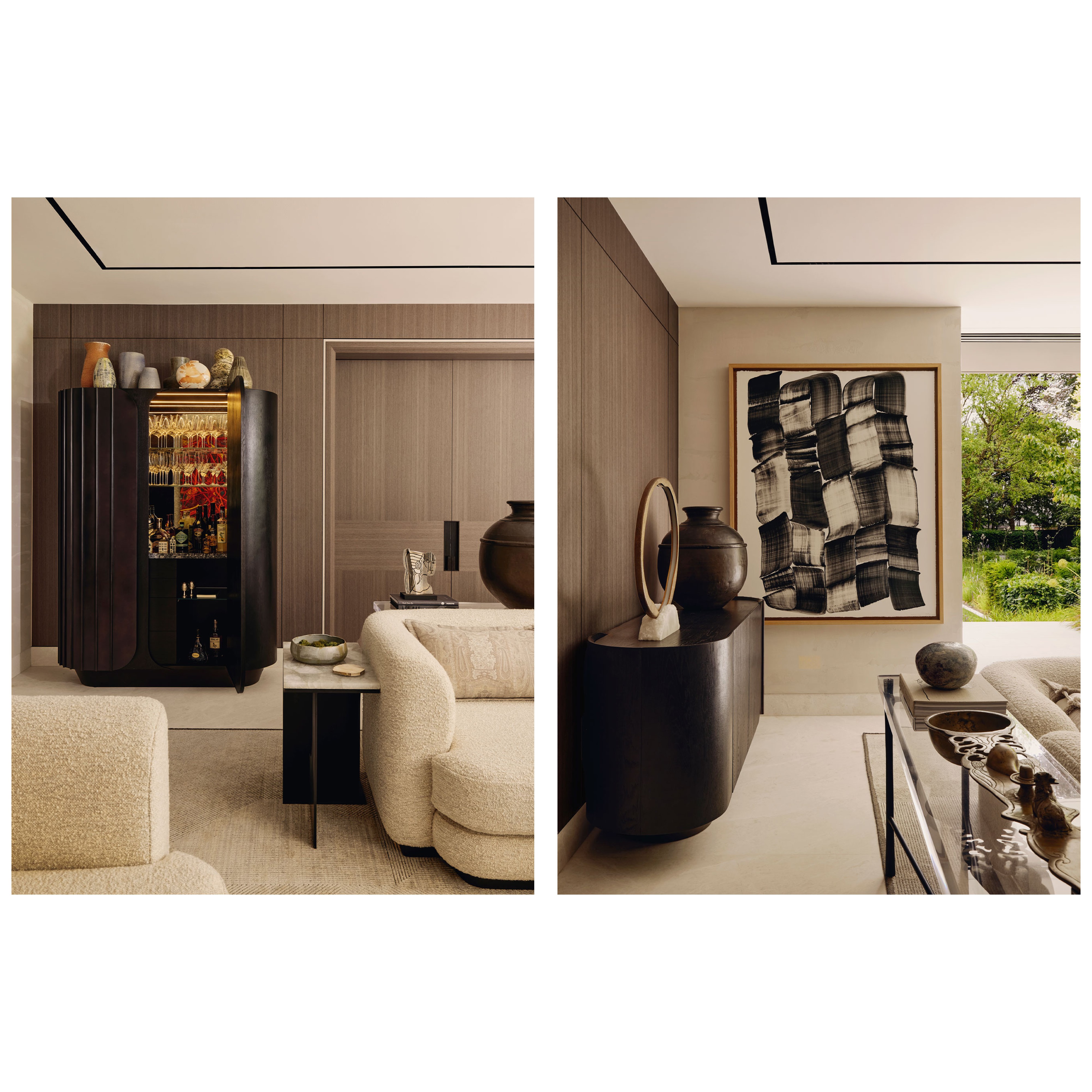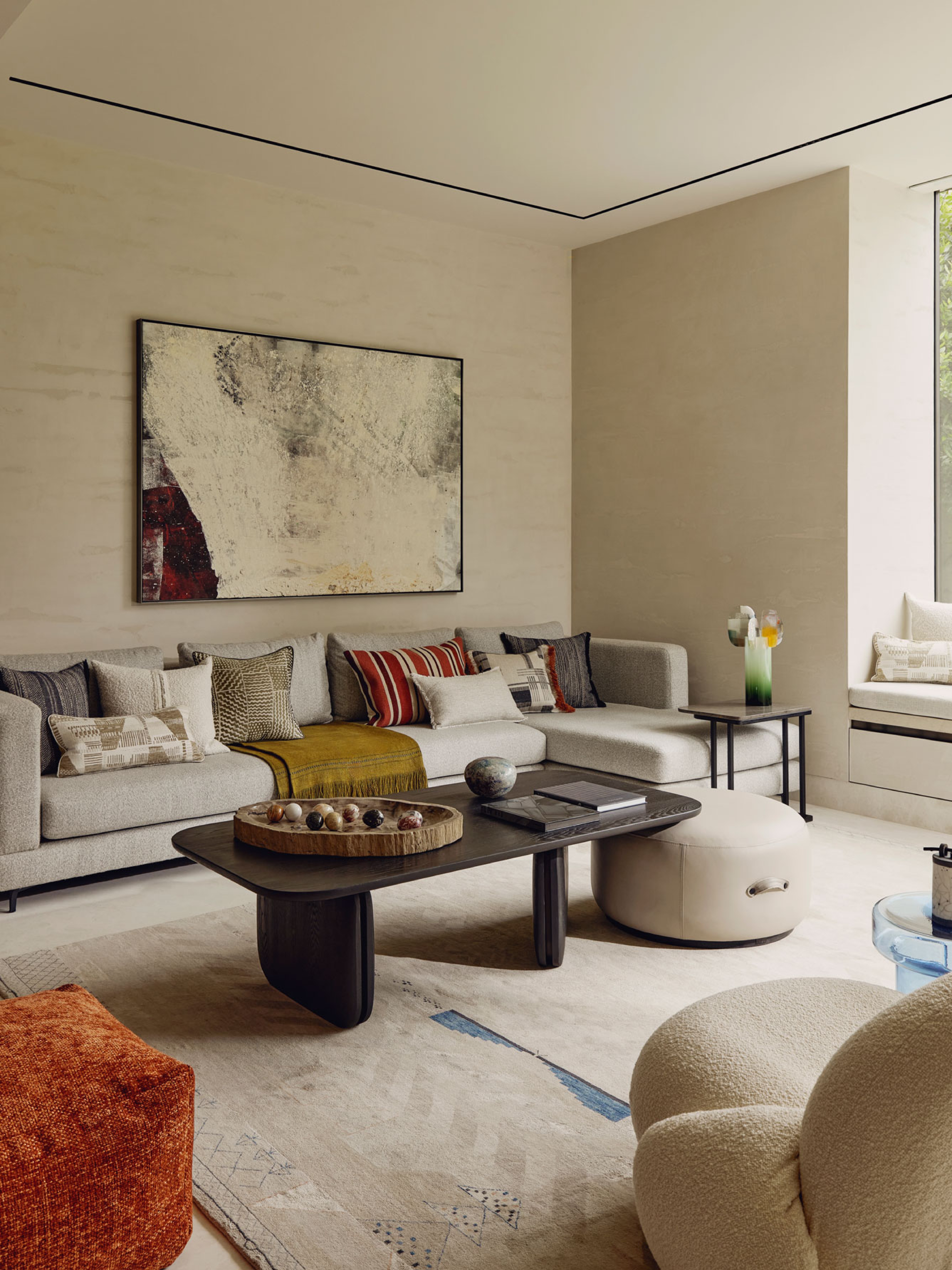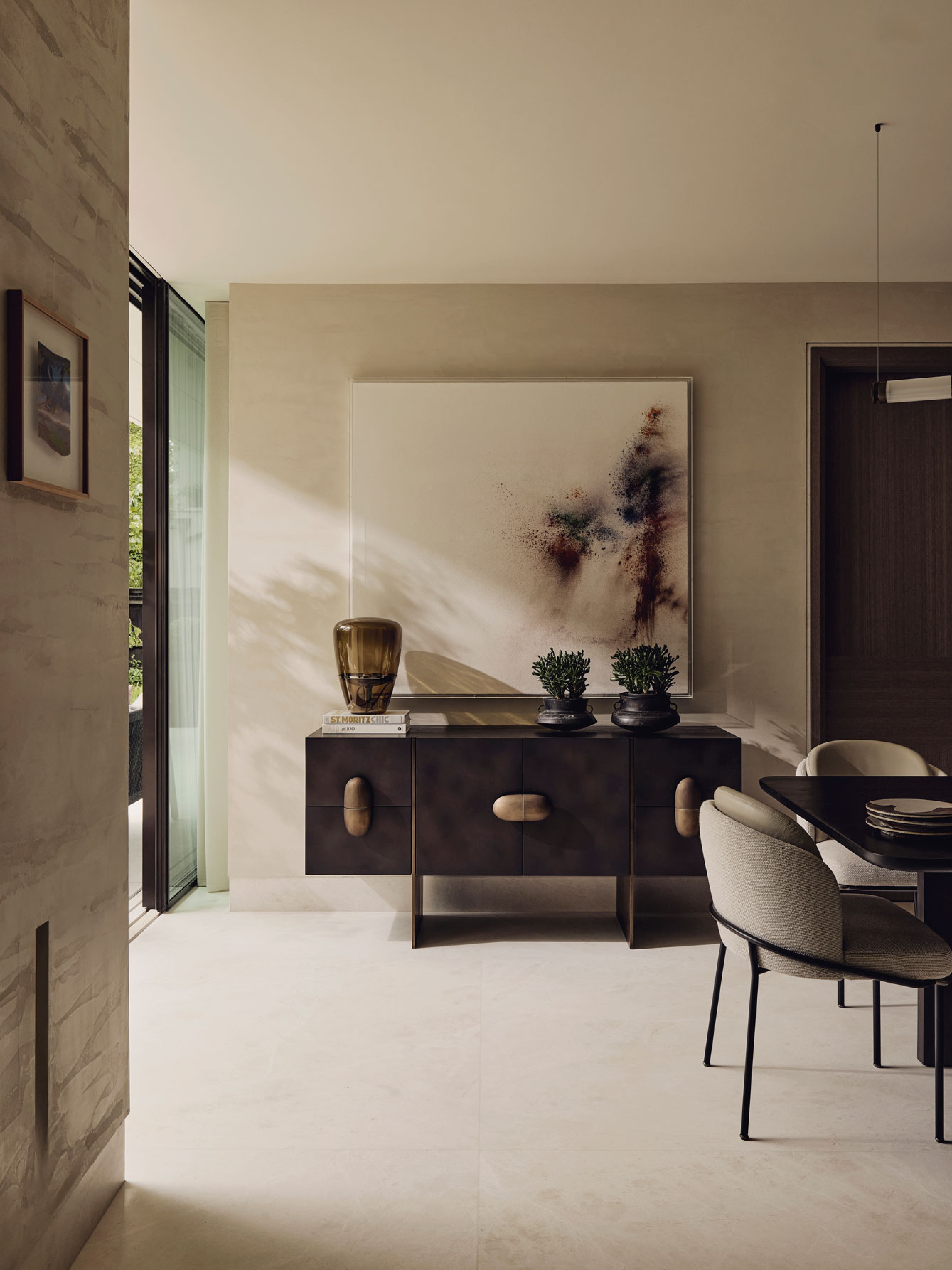 KoKo by K2India worked intensively on the interior detailing, developing customised furniture pieces—sculptural bases, consoles and bespoke hardware including individually designed door handles. These elements were conceived to sit in quiet dialogue with the home’s material palette, adding depth without disrupting its architectural restraint.