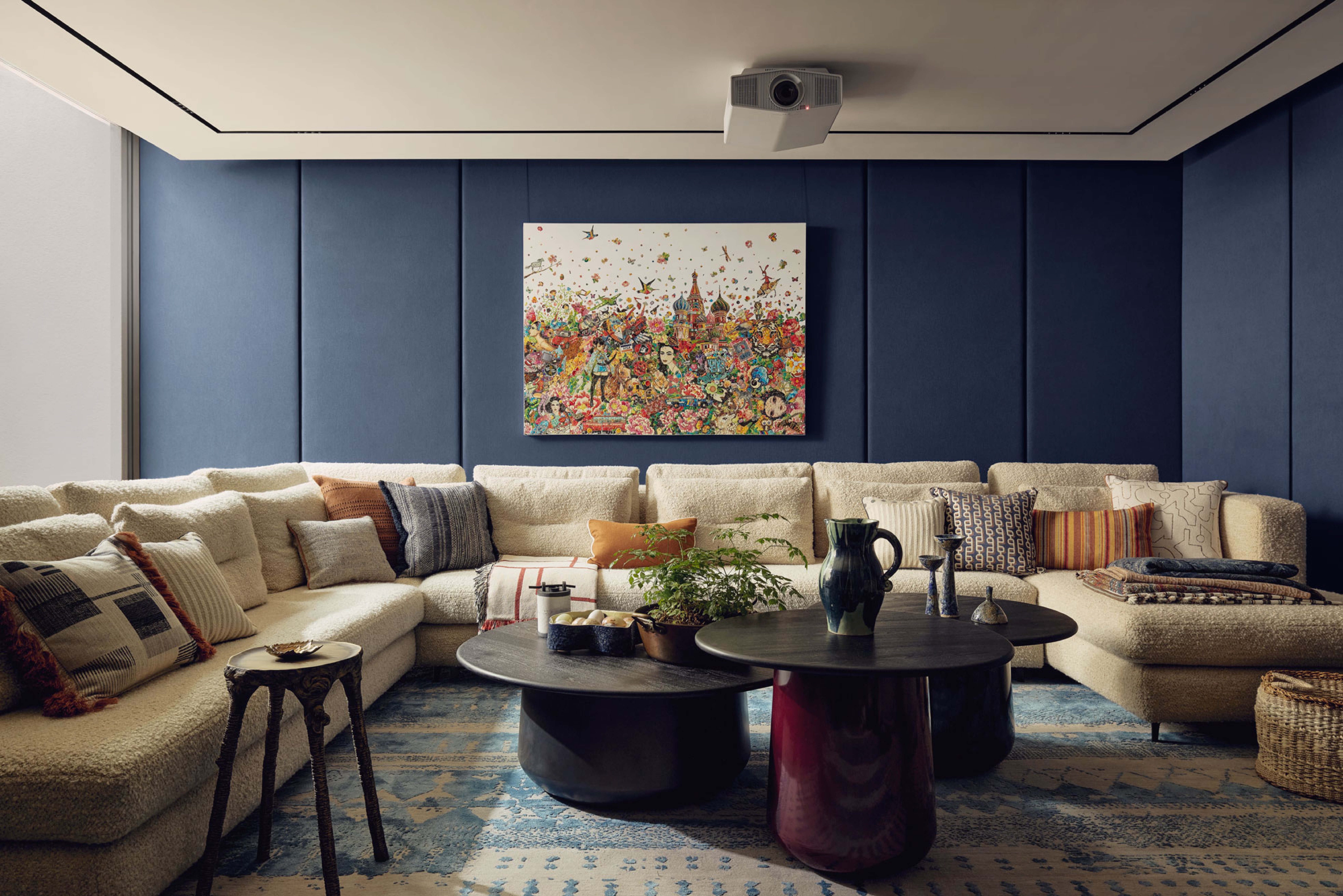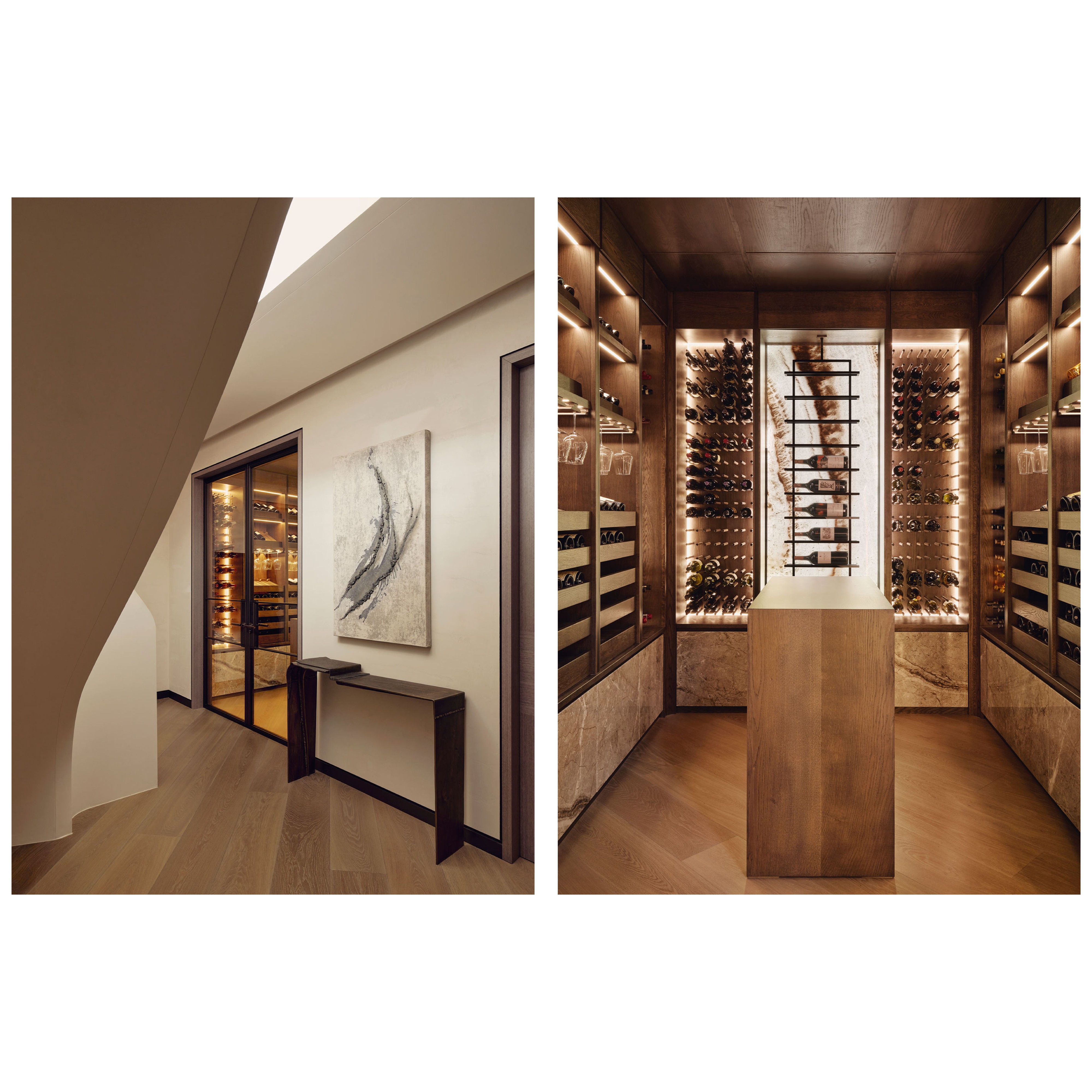 The house extends vertically: down to the basement and up to the first floor and attic. The basement features the TV lounge, defined by deep blue panelling that provides both acoustics and character. A temperature-controlled wine room sits adjacent.